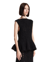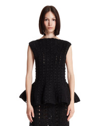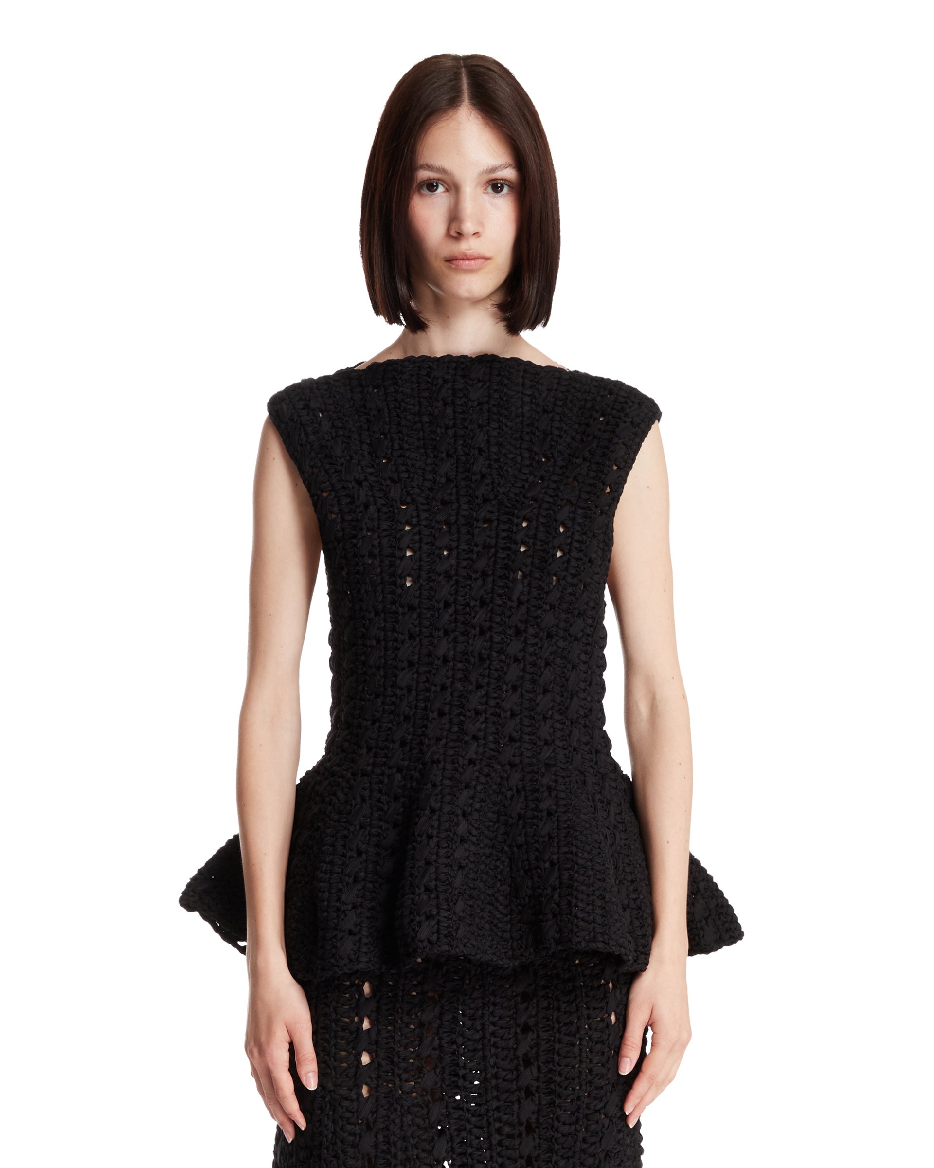 Khaite Black Evita Top. Black cotton blend, hand-crocheted with an open knit, sleeveless, boat neckline, peplum silhouette hem. Alicia is 173 cm and she is wearing size S. DETAILS Model: 18006130200 Composition: 71% Cotton, 29% Nylon Made in: USA Season: FW25-26