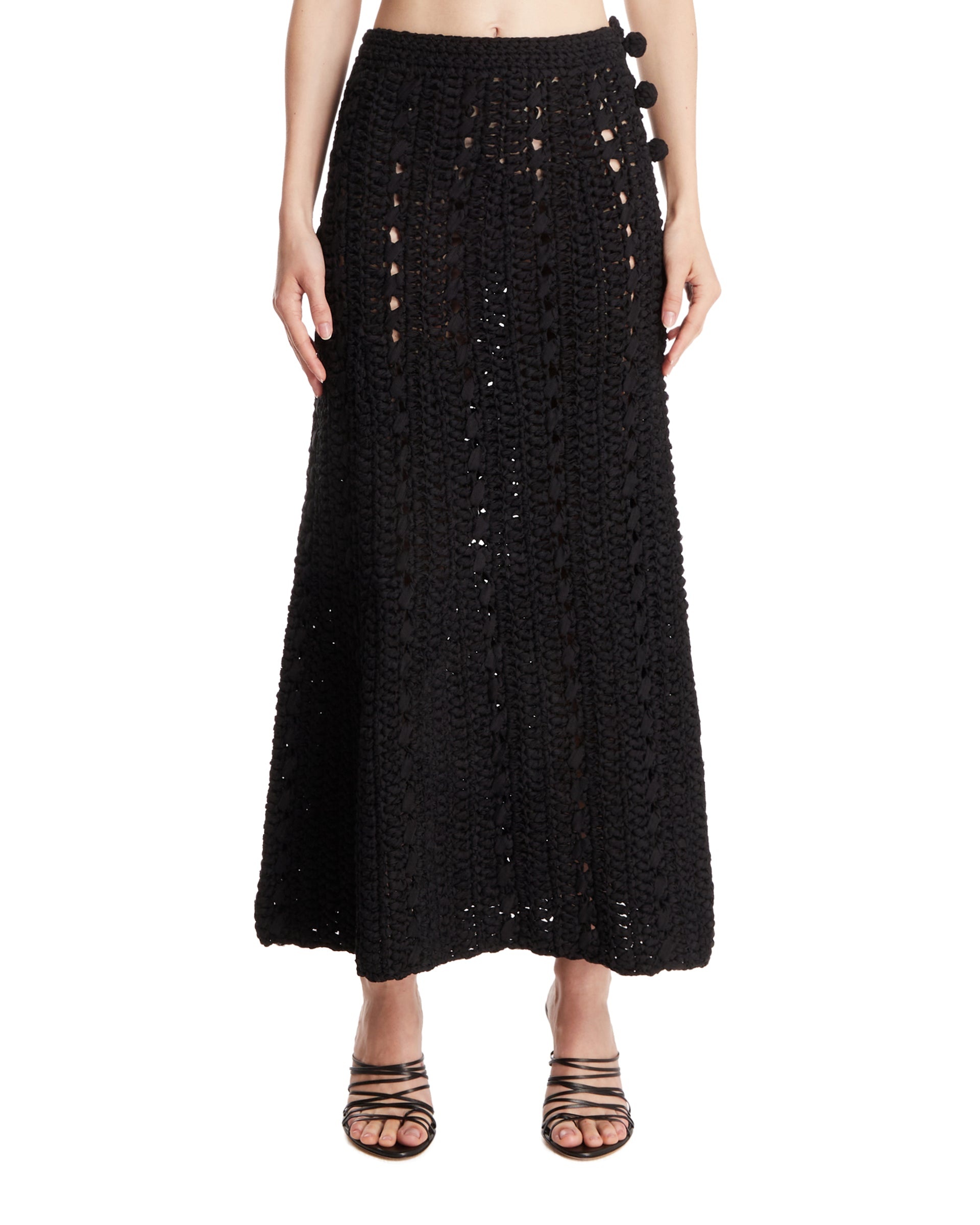 Khaite Black Ryder Skirt. Black cotton blend, hand-crocheted with an open knit, regular waist, slim fit. Side closures with knotted buttons, midi length. Alicia is 173 cm and she is wearing size S. DETAILS Model: 8896130200 Composition: 71% Cotton, 29% Nylon Made in: USA Season: FW25-26