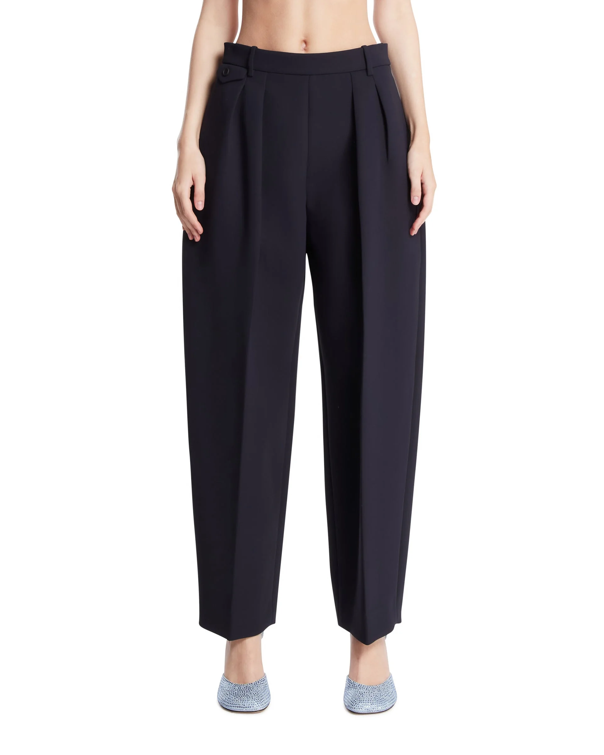 Khaite Blue Dugan Pants. Blue wool, hidden side closure, belt loops, pleats, side seam pockets, front coin pocket with button, two welt pockets at the back, tapered leg, straight hem. Janne is 179 cm and she is wearing size 4. DETAILS Model: 31794114979 Composition: 100% Wool Made in: ITALY Season: FW25-26