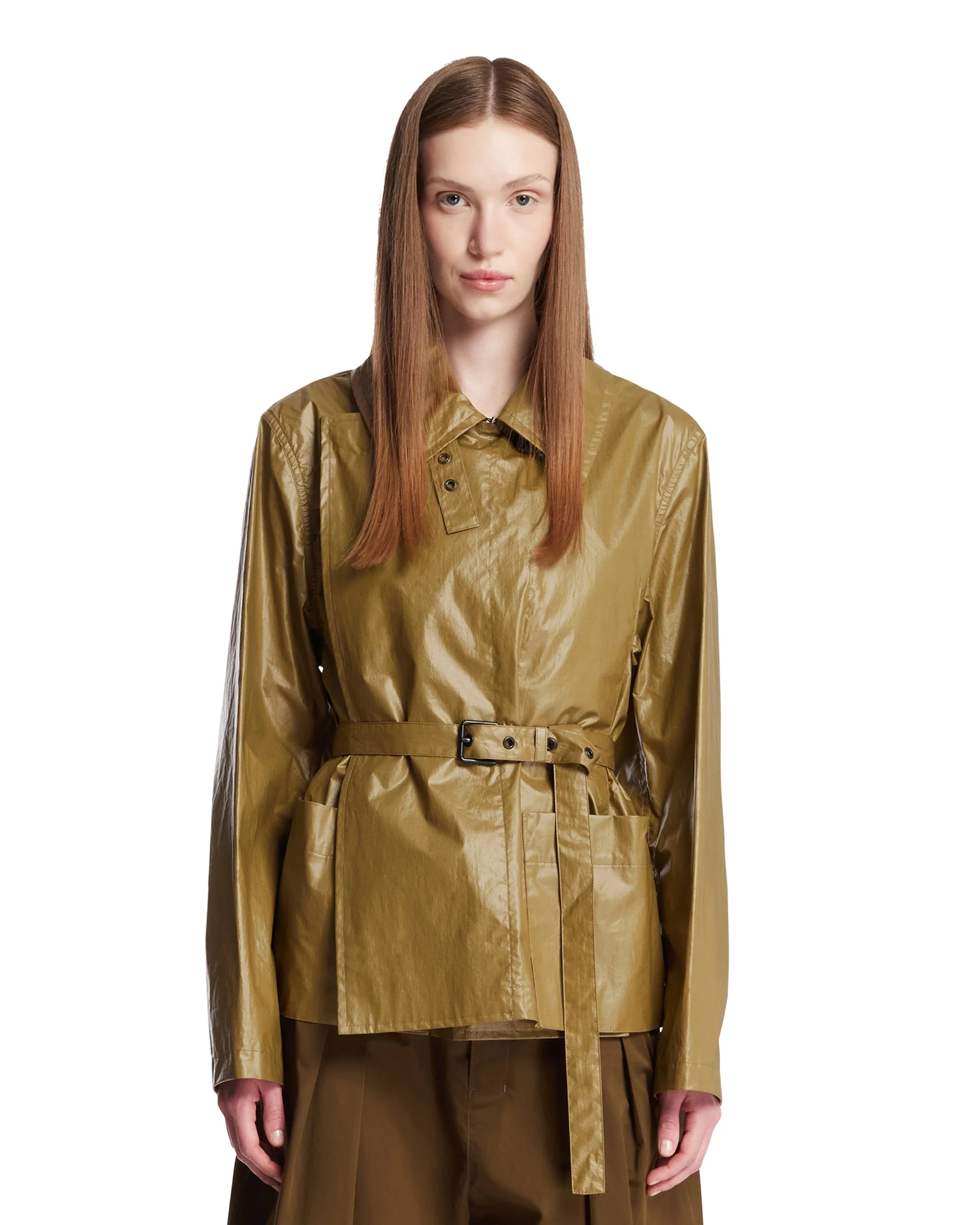 Lemaire Brown Belted Jacket. Shiny brown cotton, collar with strap, long sleeves, concealed front fastening, matching belt, two front patch pockets, straight hem. Yana is 178 cm and she is wearing size 36. DETAILS Model: OW1200LF1381GR643 Composition: 100% Cotton Made in: ROMANIA Season: SS26