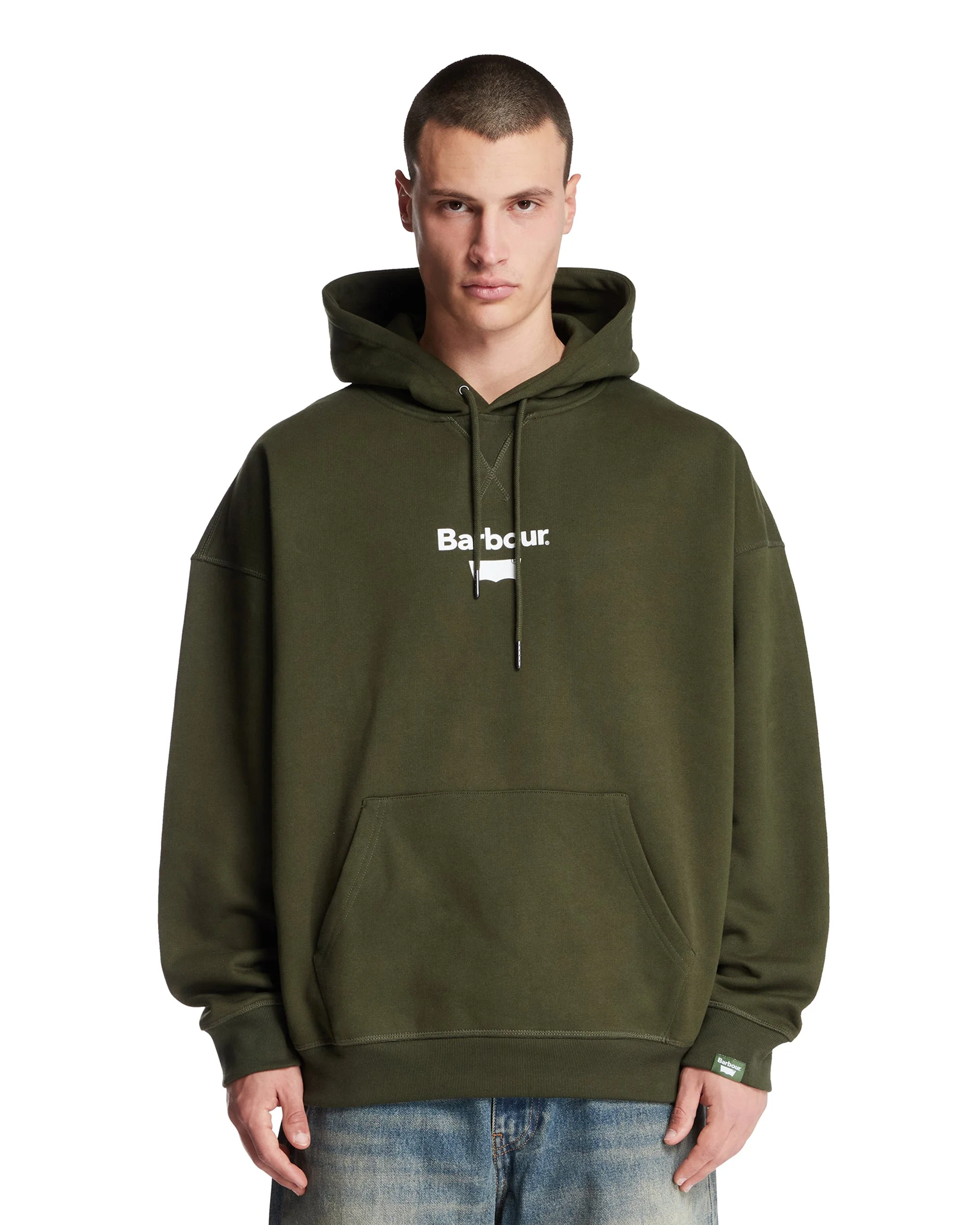 Levis x Barbour Green Graphic Hoodie. Green cotton, long sleeves, tonal drawstring hood. Dropped shoulders, kangaroo front pocket and ribbed hem and cuffs. Logo printed on chest and contrasting graphic on back panel. Regular fit. Mitar is 186 cm and he is wearing size XL. DETAILS Model: 008GM00050BAR Composition: 100% Cotton Made in: PORTUGAL Season: FW25-26