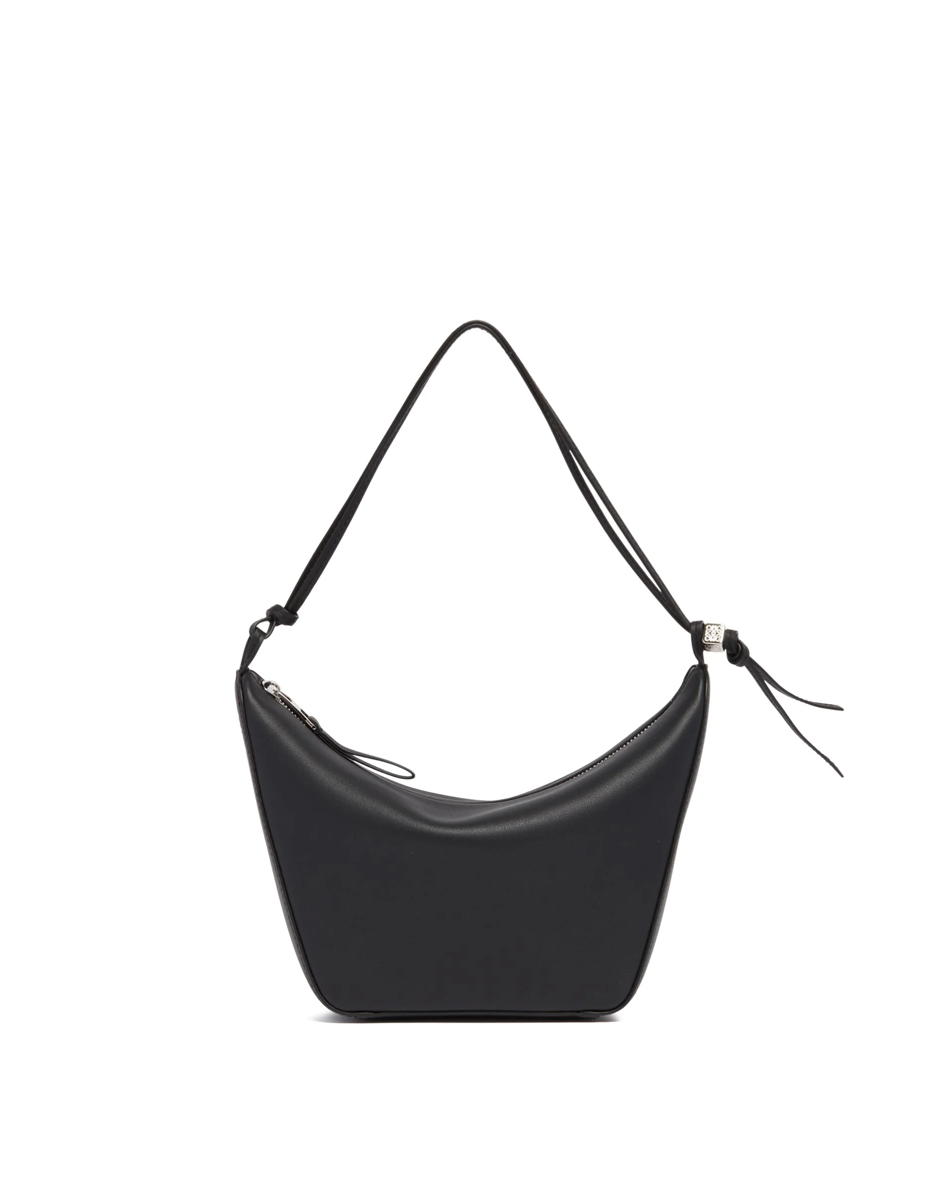 Loewe Black Hammock Hobo Mini Bag. Black leather, tonal knotted calfskin strap, Zip fastening. Calfskin zip pull, Herringbone cotton canvas lining and Anagram dice. Size (cm): 28X17X9.5 DETAILS Model: A538G13X011100 Composition: 100% Leather Made in: SPAIN Season: SS25