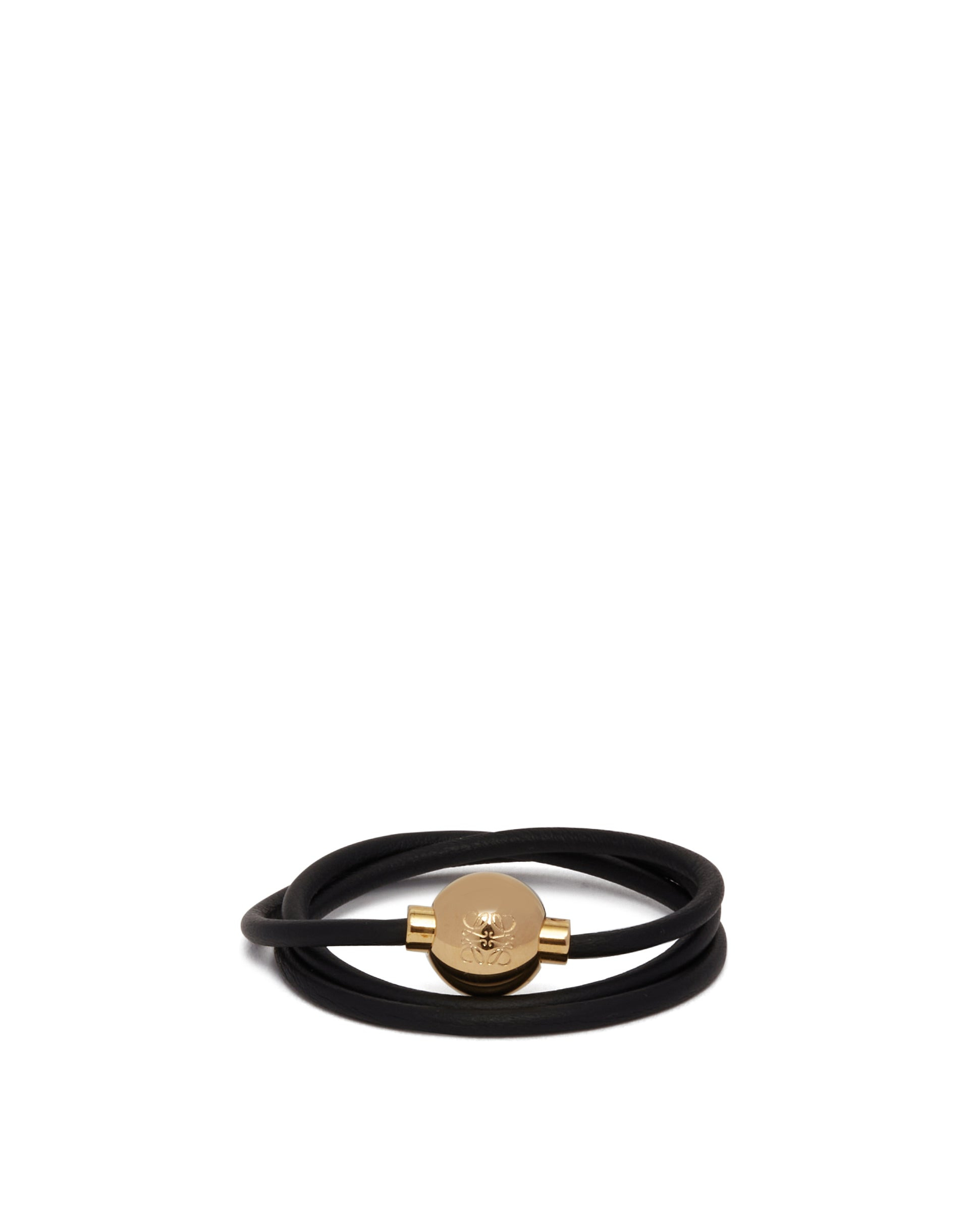 Loewe Black Pebble Bracelet. Black leather, multi-wrap tubular strap, Pebble detail with engraved Anagram logo, magnetic closure, gold-tone hardware. DETAILS Model: JJ07240X011206 Composition: 100% Leather; Detail: 100% Brass Made in: SPAIN Season: FW25-26