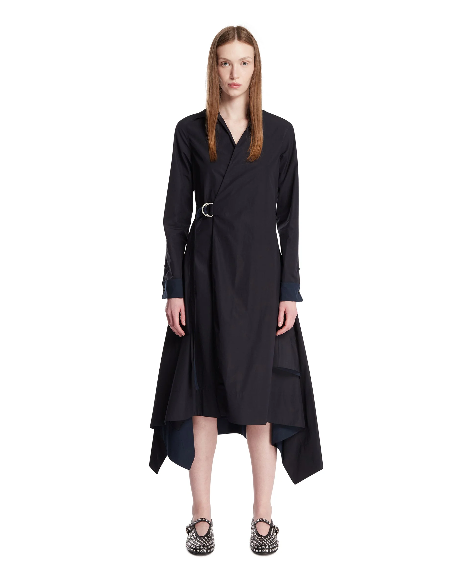 Loewe Blue Draped Cotton Dress. Blue cotton, asymmetric silhouette, front wrap closure with draped skirt. Classic collar, long sleeves, regular fit, midi length, side belt closure. Contrasting yoke, under-bust, and inside cuffs. D-ring with engraved logo. Yana is 178 cm and she is wearing size 36. DETAILS Model: S359Y09XJL5110 Composition: 100% Cotton; Detail: 100% Brass Made in: MADAGASCAR Season: SS26