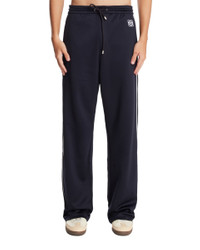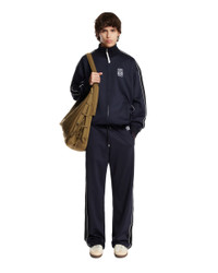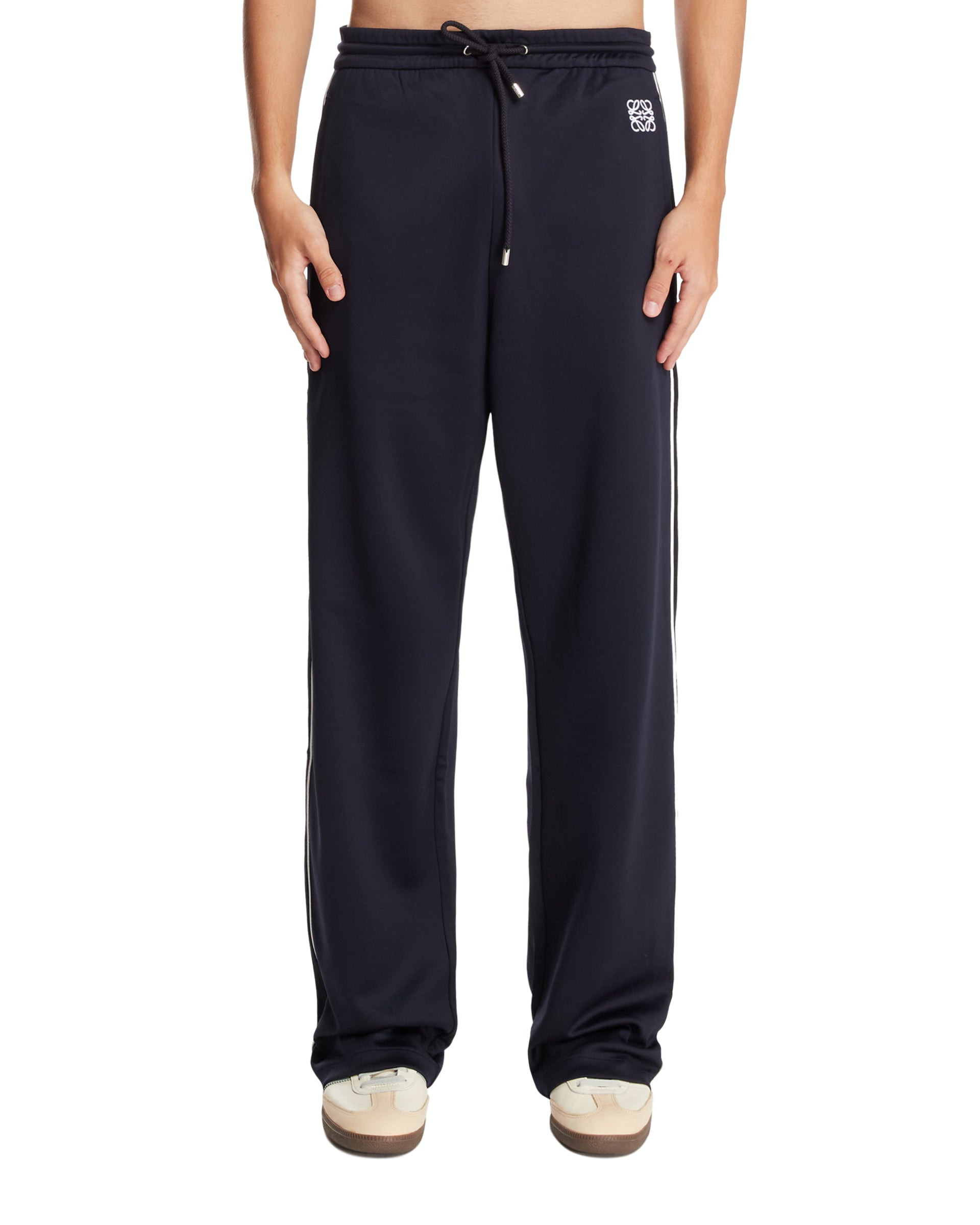 Loewe Blue Tracksuit Pants. Blue cotton-blend and technical jersey, contrast trims, elasticated mid-rise waistband with drawstring, straight-leg design. Side zip pockets, back zip pocket, Anagram embroidery on one side, regular fit. Freddy is 187 cm and he is wearing size L. DETAILS Model: H526Y04X599602 Composition: 56% Polyamide, 44% Cotton Made in: PORTUGAL Season: FW25-26