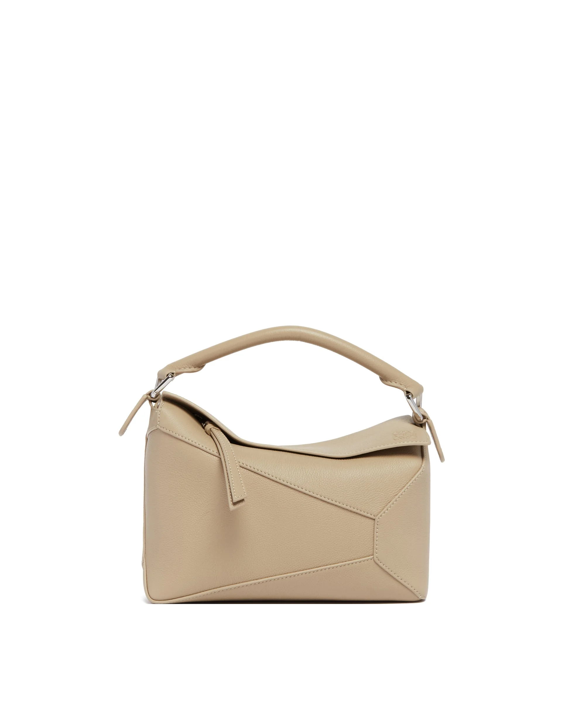 Loewe Beige Small Puzzle Edge Bag. Beige leather, iconic design with geometric lines and a cubic shape. Adjustable and detachable tone-on-tone shoulder strap, zip closure with calfskin puller, external back zip pocket, internal open pocket. Herringbone cotton canvas lining, embossed Anagram logo, gold-tone hardware. Size (cm): 24X16X10 DETAILS Model: A510P60XAW5541 Composition: 100% Leather; Details: 100% Brass Made in: SPAIN Season: SS26