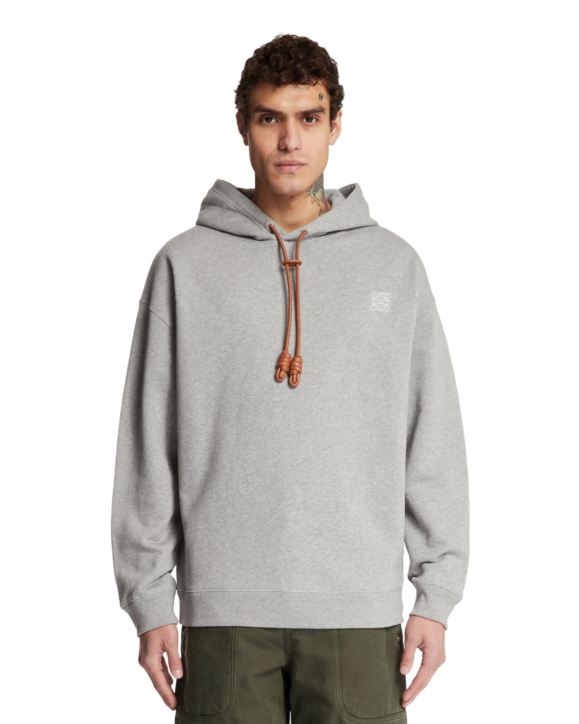 Loewe Gray Hoodie. Gray cotton, leather drawstrings inspired by Flamenco, ribbed cuffs and hem, long sleeves. Hooded collar with a leather application featuring a debossed Anagram pattern on the back. Relaxed fit. Leandro is 187 cm and he is wearing size L. DETAILS Model: H526Y25X531440 Composition: 100% Cotton; Details: 100% Leather Made in: PORTUGAL Season: SS25