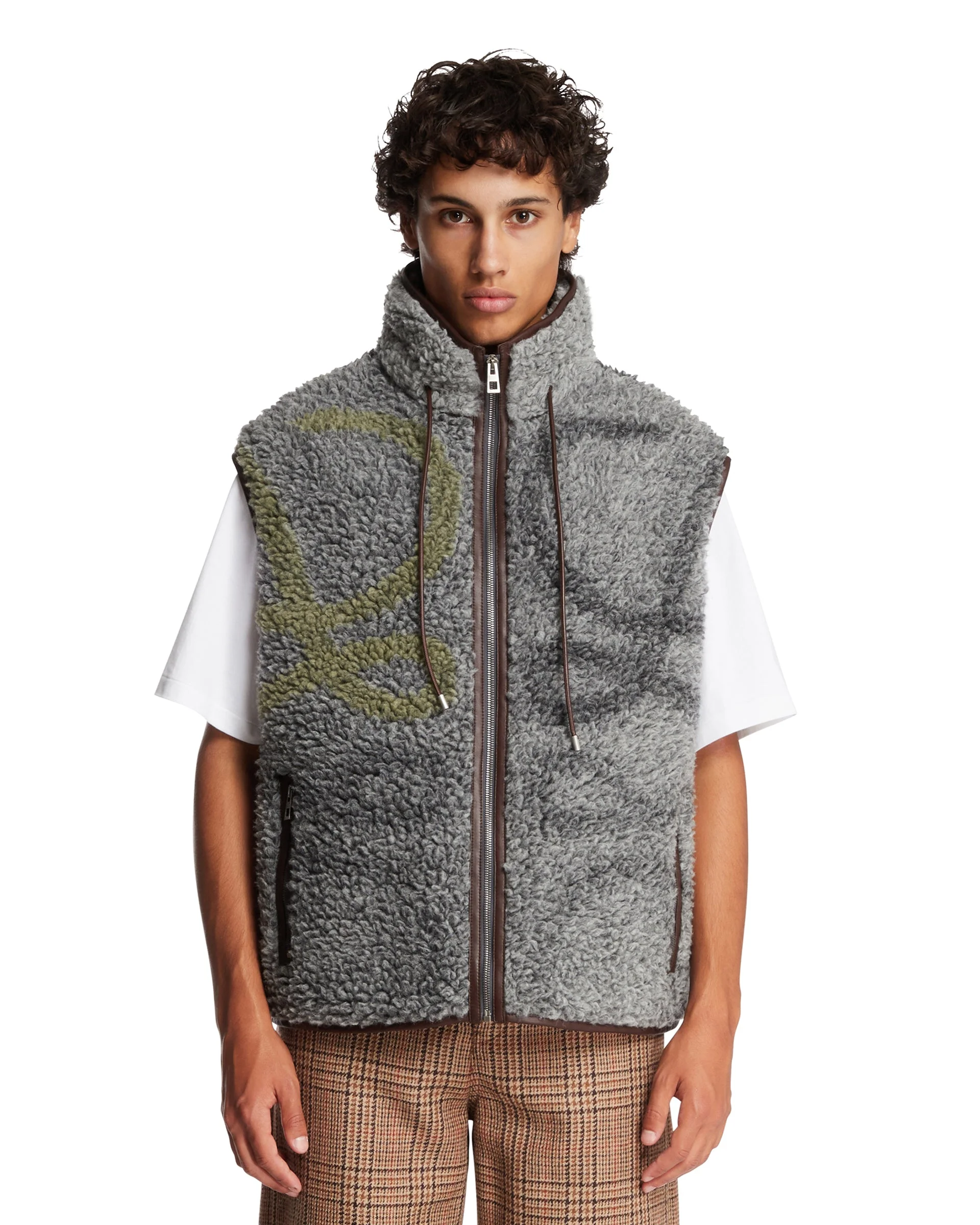 Loewe Gray Wool Blend Vest. Gray jacquard fleece wool blend, Anagram motif applique on front and back, sleeveless, high collar with leather drawstring. Leather trim, front zip closure, zippered welt pockets. Yassine is 187 cm and he is wearing size L. DETAILS Model: H526Y02X369990 Composition: 40% Polyester, 40% Wool, 20% Acrylic Made in: ITALY Season: FW25-26