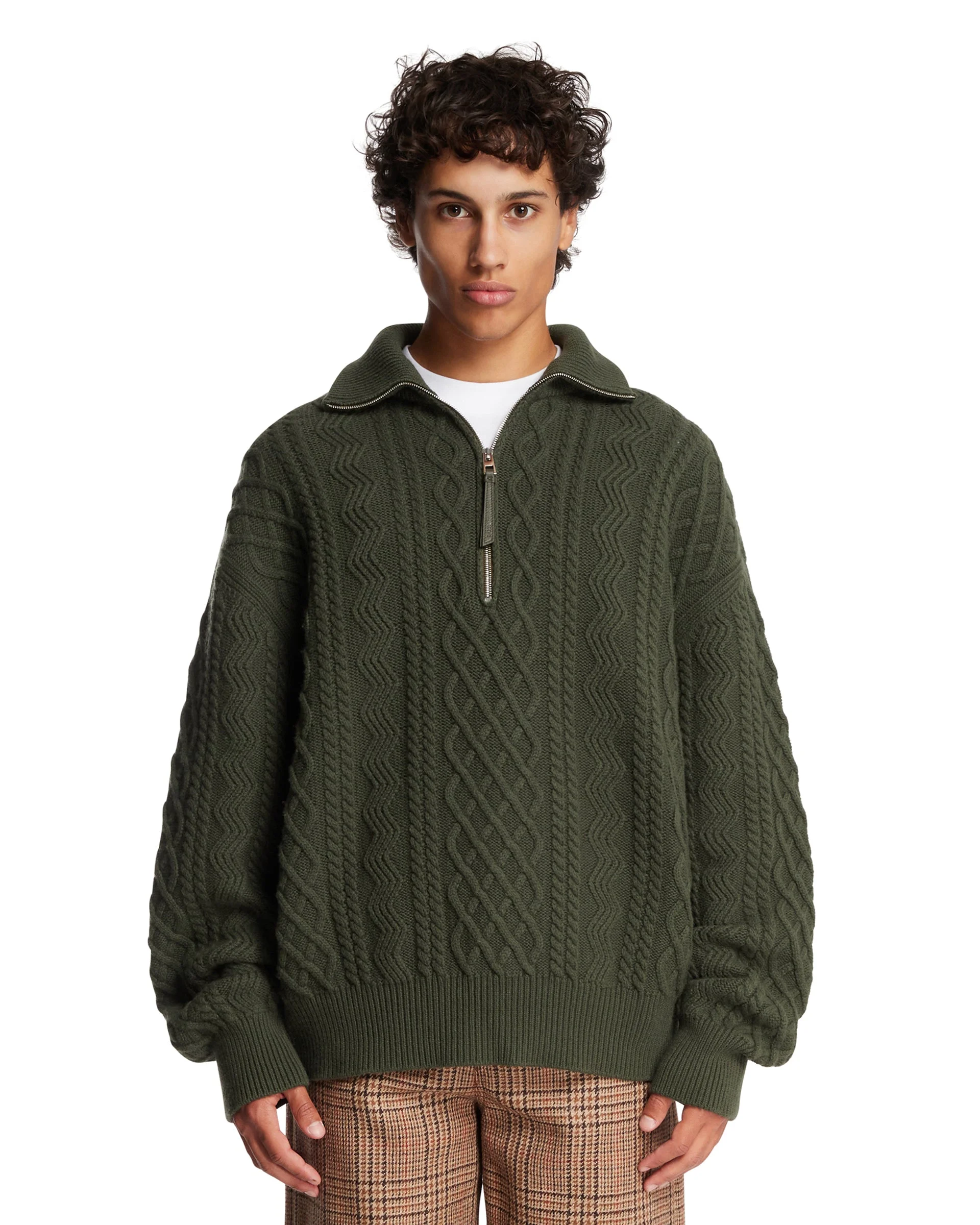 Loewe Green Wool Zip-Up Sweater. Green wool, woven texture, long sleeves, zip collar with Puzzle leather puller, ribbed collar, cuffs and hem, regular fit. Yassine is 187 cm and he is wearing size XL. DETAILS Model: H526Y14KMR4160 Composition: 100% Wool Made in: ITALY Season: FW25-26