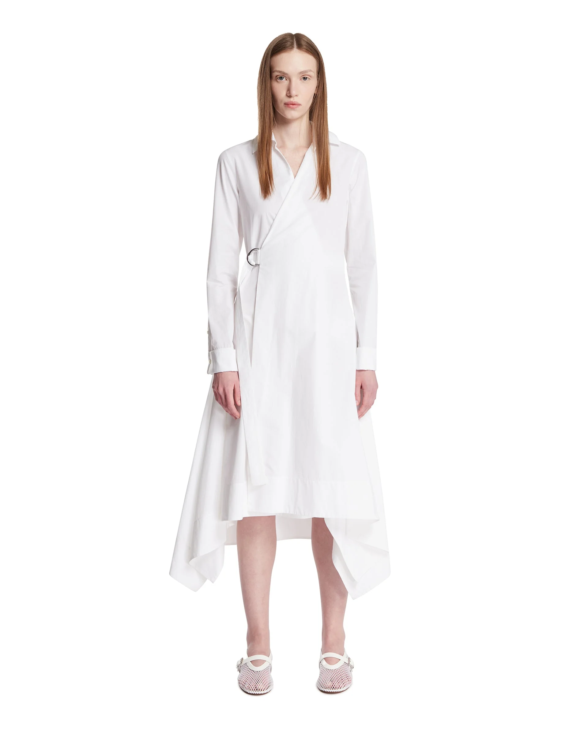 Loewe White Draped Cotton Dress. White cotton, asymmetric silhouette, front wrap closure with draped skirt. Classic collar, long sleeves, regular fit, midi length, side belt closure. Contrasting yoke, under-bust, and inside cuffs. D-ring with engraved logo. Yana is 178 cm and she is wearing size 36. DETAILS Model: S359Y09XJL2100 Composition: 100% Cotton; Detail: 100% Brass Made in: MADAGASCAR Season: SS26