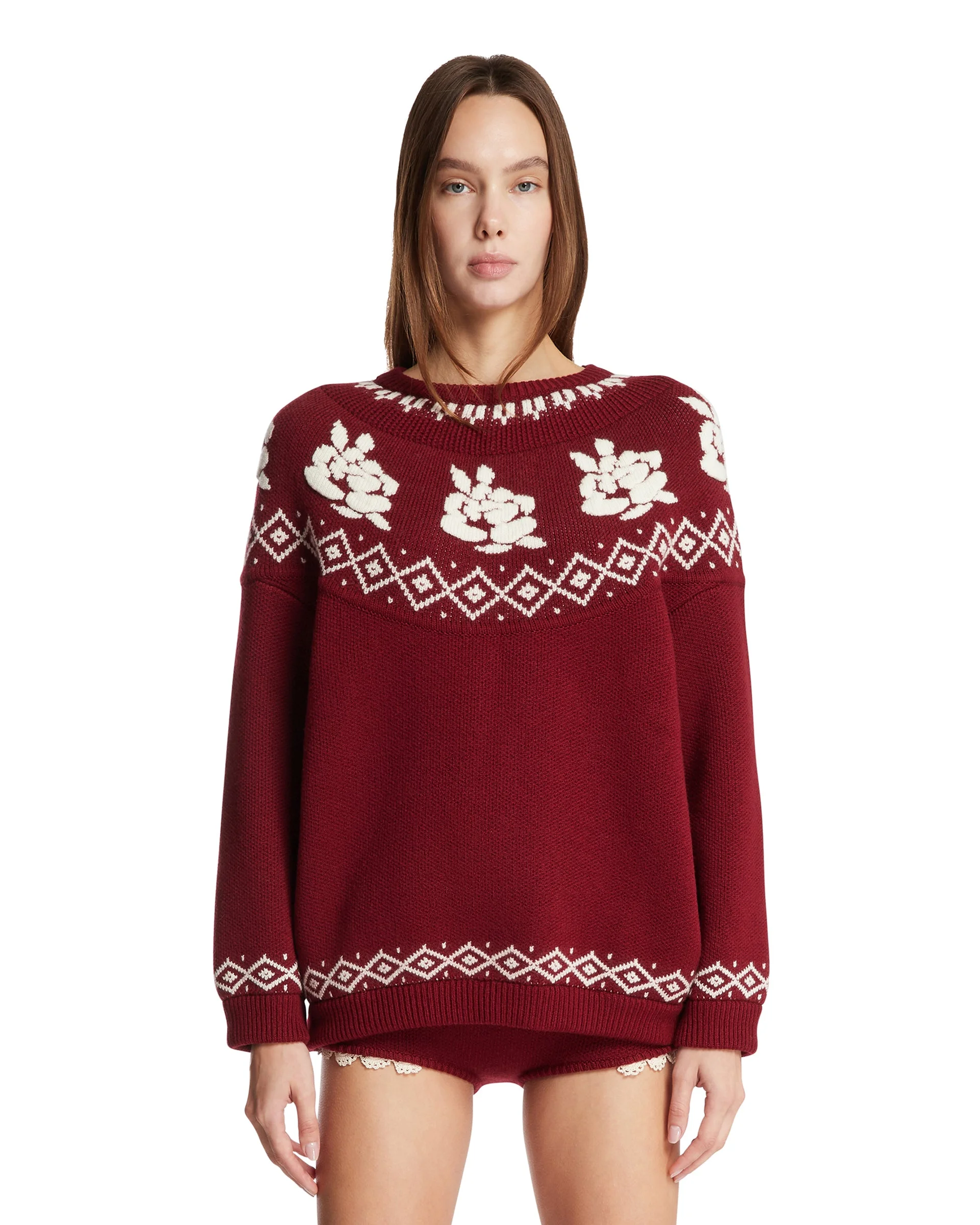 Magda Butrym Burgundy Jacquard Wool Sweater. Burgundy wool, jacquard knit with contrasting white decorations, long sleeves, drop shoulder design, ribbed collar, cuffs and hem, relaxed fit. Daniele is 178 cm and she is wearing size 36. DETAILS Model: 297925BOR Composition: 100% Wool Made in: POLAND Season: FW25-26