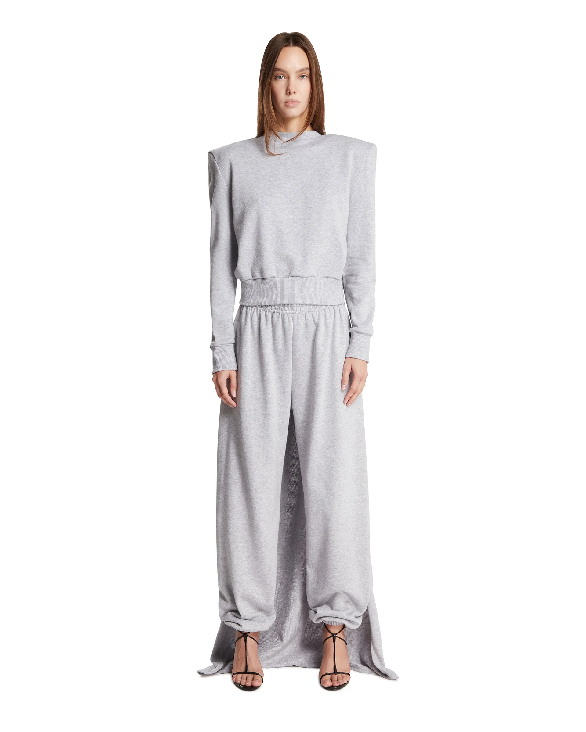 Magda Butrym Gray Sweatshirt with Integrated Scarf. Gray cotton, structured shoulders, extra-long tone-on-tone integrated scarf. Long sleeves, straight hem. Regular fit. Daniele is 178 cm and she is wearing size 36. DETAILS Model: 223925GRE Composition: 100% Cotton Made in: POLAND Season: FW25-26