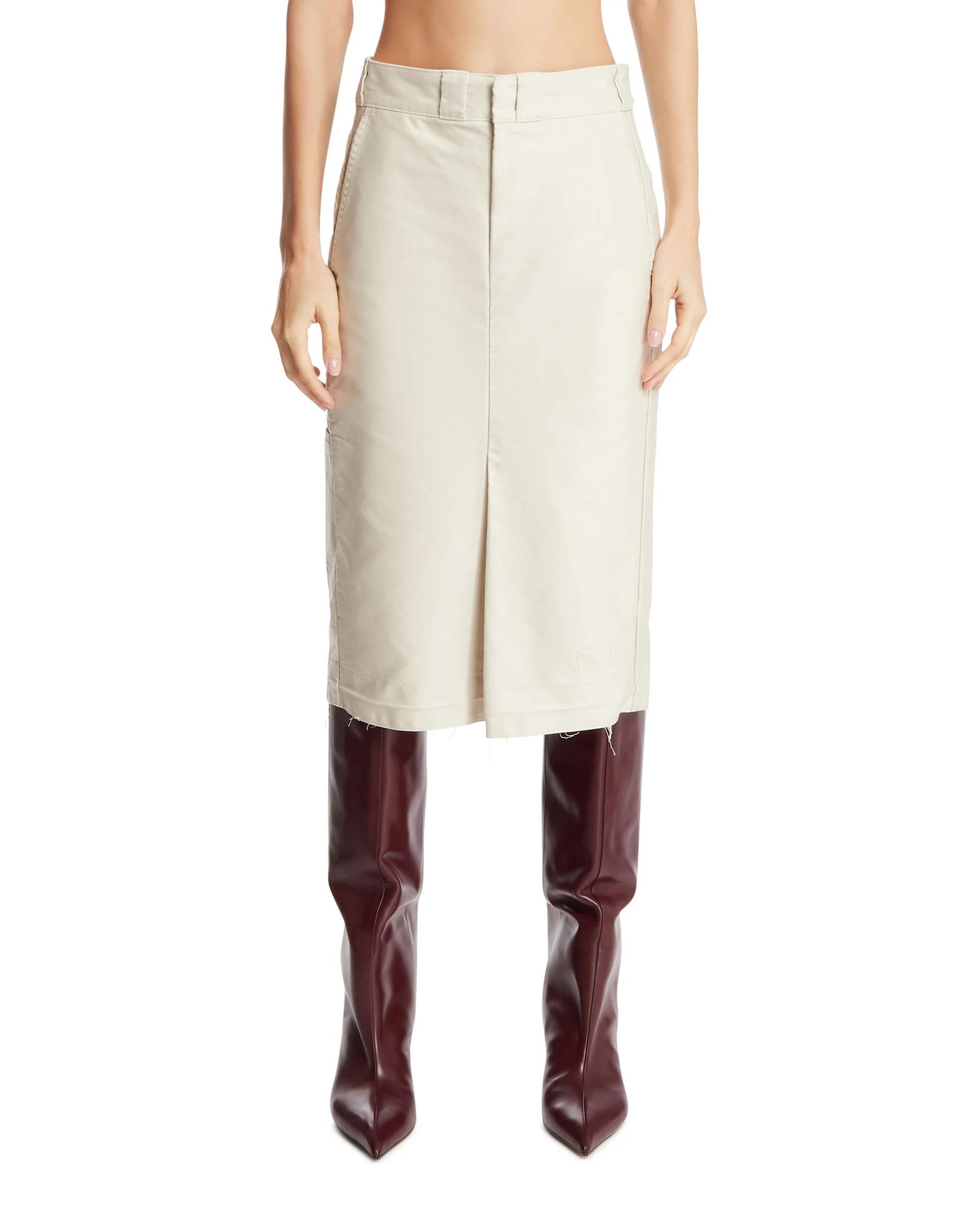 Maison Margiela White Midi Chino Skirt. White cotton, high waist, front button and zip closure, midi length, four-pocket design. Decorative stitching, column silhouette, iconic Four Stitches logo on the back of the garment. Regular fit. Daniele is 178 cm and she is wearing size 40. DETAILS Model: S51ME0047M35539112 Composition: 100% Cotton Made in: ITALY Season: FW25-26