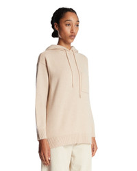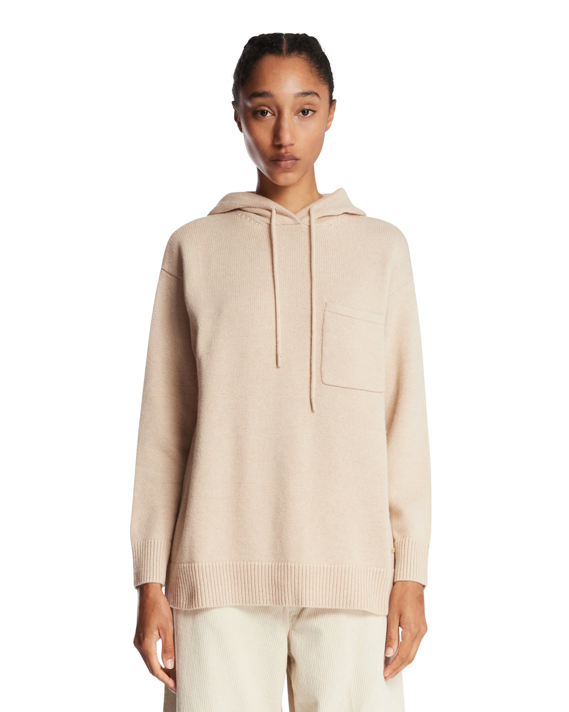 Max Mara Beige Wool and Cashmere Hoodie. Beige shaved wool and cashmere yarn, drawstring hood with tone-on-tone enameled metal tips, long sleeves with dropped shoulders. Patch pocket on the left chest, ribbed cuffs and hem, logo tag on the front hem. Aline is 180 cm and she is wearing size S. DETAILS Model: 2521366132600006 Composition: 70% Wool, 30% Cashmere Made in: ITALY Season: FW25-26