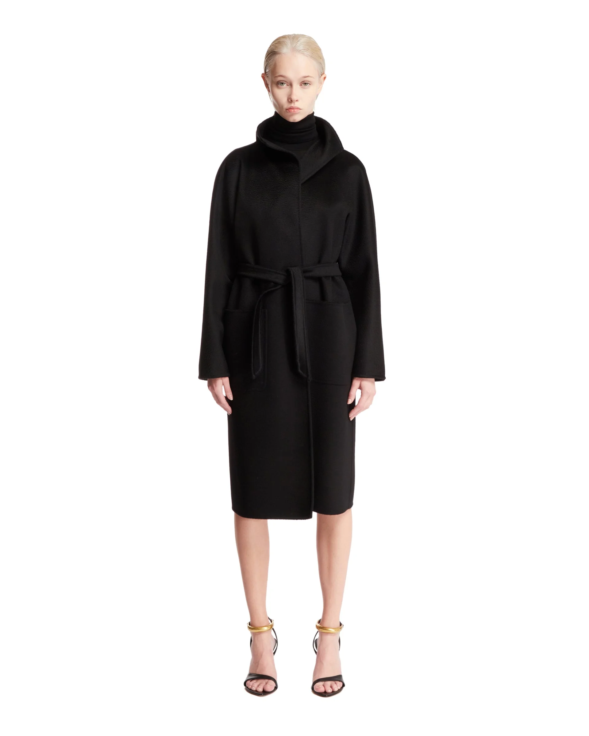 Max Mara Black Cashmere cardigan coat. Black pure double cashmere with hand-sewn sable trim, standing collar, kimono sleeves and patch pockets. Matching detachable belt. Greeta is 172 cm and she is wearing size 40. DETAILS Model: 2521016061600004 Composition: 100% Cashmere Made in: ITALIA Season: FW25-26