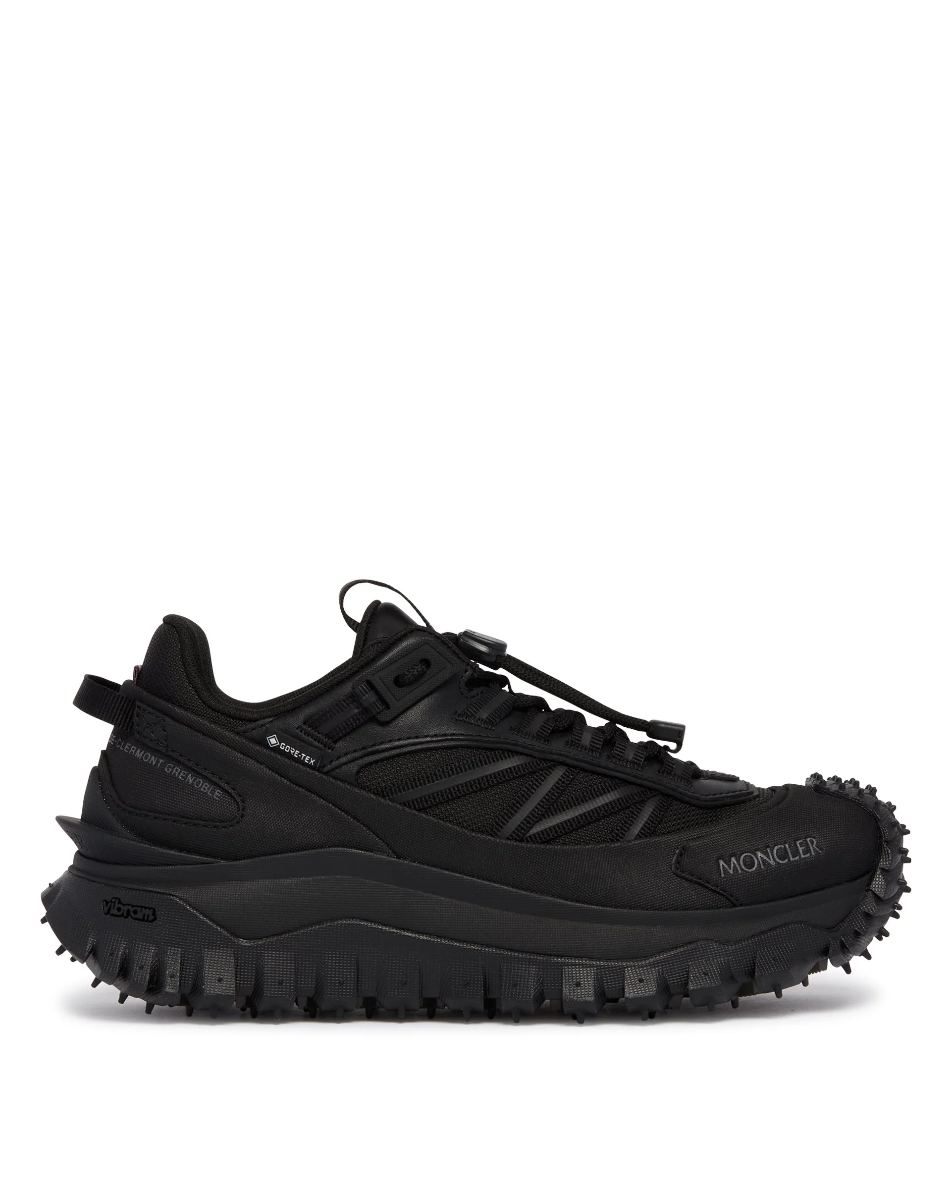 Moncler Black Trailgrip GTX Sneakers. Black leather upper, rubber and fabric with Gore-Tex membrane. Rounded toe, water-repellent toe cap, front lace-up with drawcord, logo details, EVA midsole, OrthoLite insole, Vibram Megagrip rubber outsole. DETAILS Model: 4M00110M7208999 Composition: 35% Leather, 35% Rubber, 30% Fabric; Sole: 100% Rubber Made in: VN Season: SS26
