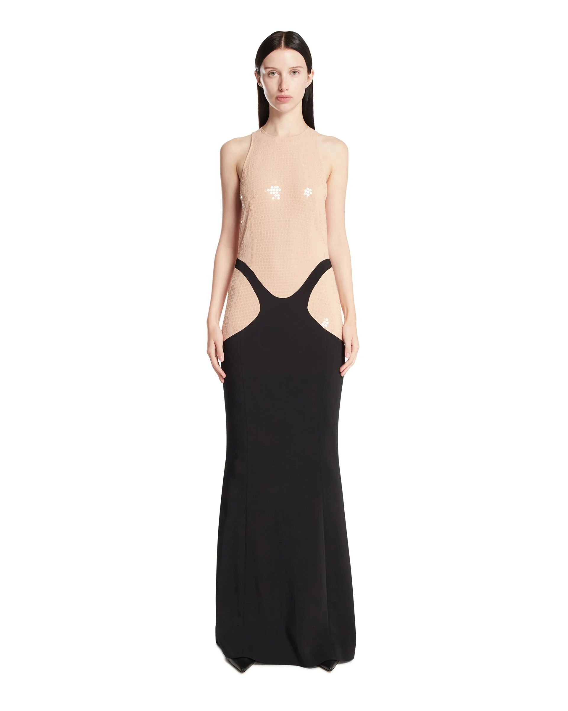 Mugler Black Re/edit Sequin Long Dress. Black viscose blend and silk, contrasting beige sequin inserts. Sleeveless, crew neck, zip closure at the back. Long mermaid silhouette skirt. Janne is 179 cm and she is wearing size 36. DETAILS Model: COM1RO17933002B2001 Composition: 96% Viscose, 4% Elastane; Details: 65% Acetate, 35% Silk; Lining: 100% Cupro Made in: PORTUGAL Season: FW25-26