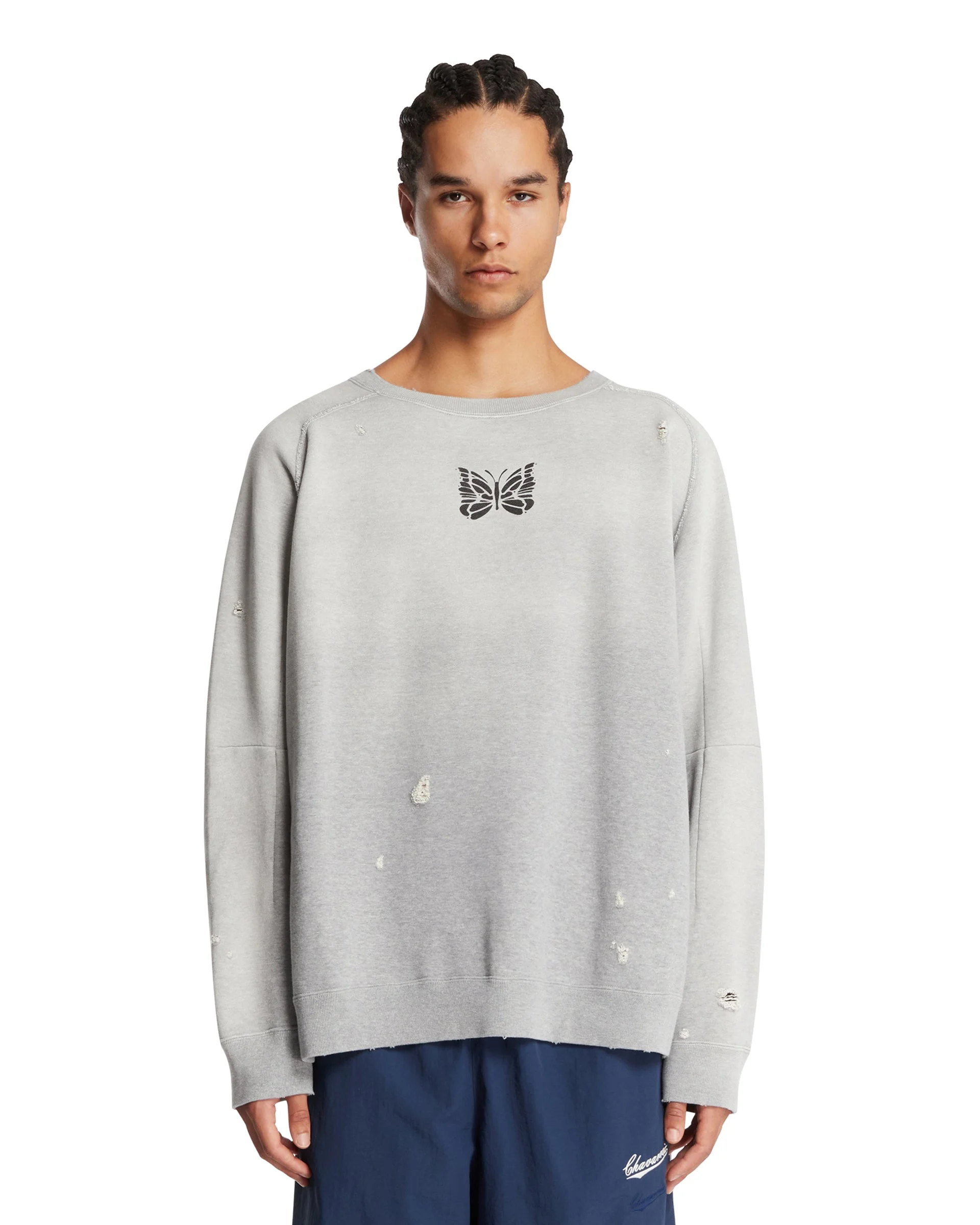 Needles Gray Cotton Logo Sweatshirt. Gray cotton, small rips throughout the garment, long sleeves, crew neck, ribbed hem and cuffs. Contrasting hem detail on the chest, regular fit. Thiago is 185 cm and he is wearing size XL. DETAILS Model: RW336AHGREY Composition: 100% Cotton Made in: JAPAN Season: FW25-26