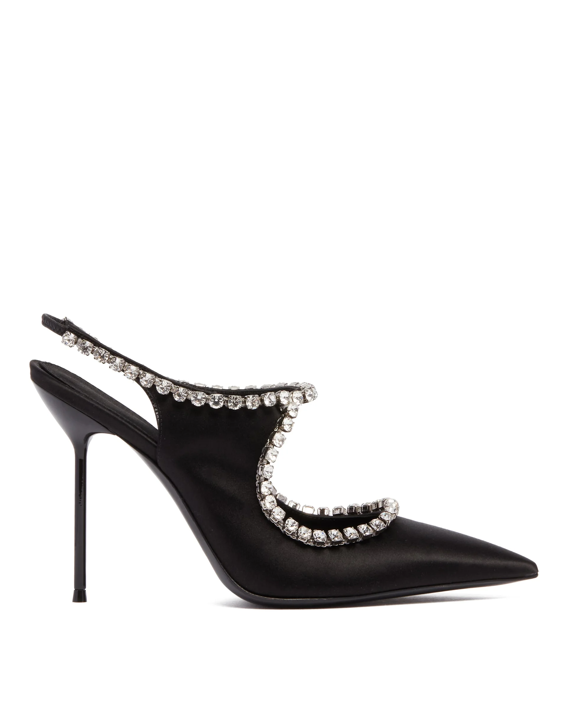 Paris Texas Black Crystal Pumps. Black fabric upper with crystal embellishment, pointed toe. Slingback design with elastic insert, high stiletto heel. Leather sole, branded insole. Heel Height: 11 cm DETAILS Model: PX1768XSTCRBCD Composition: 100% Fabric; Details: 100% Glass; Sole: 100% Leather Made in: ITALY Season: FW25-26