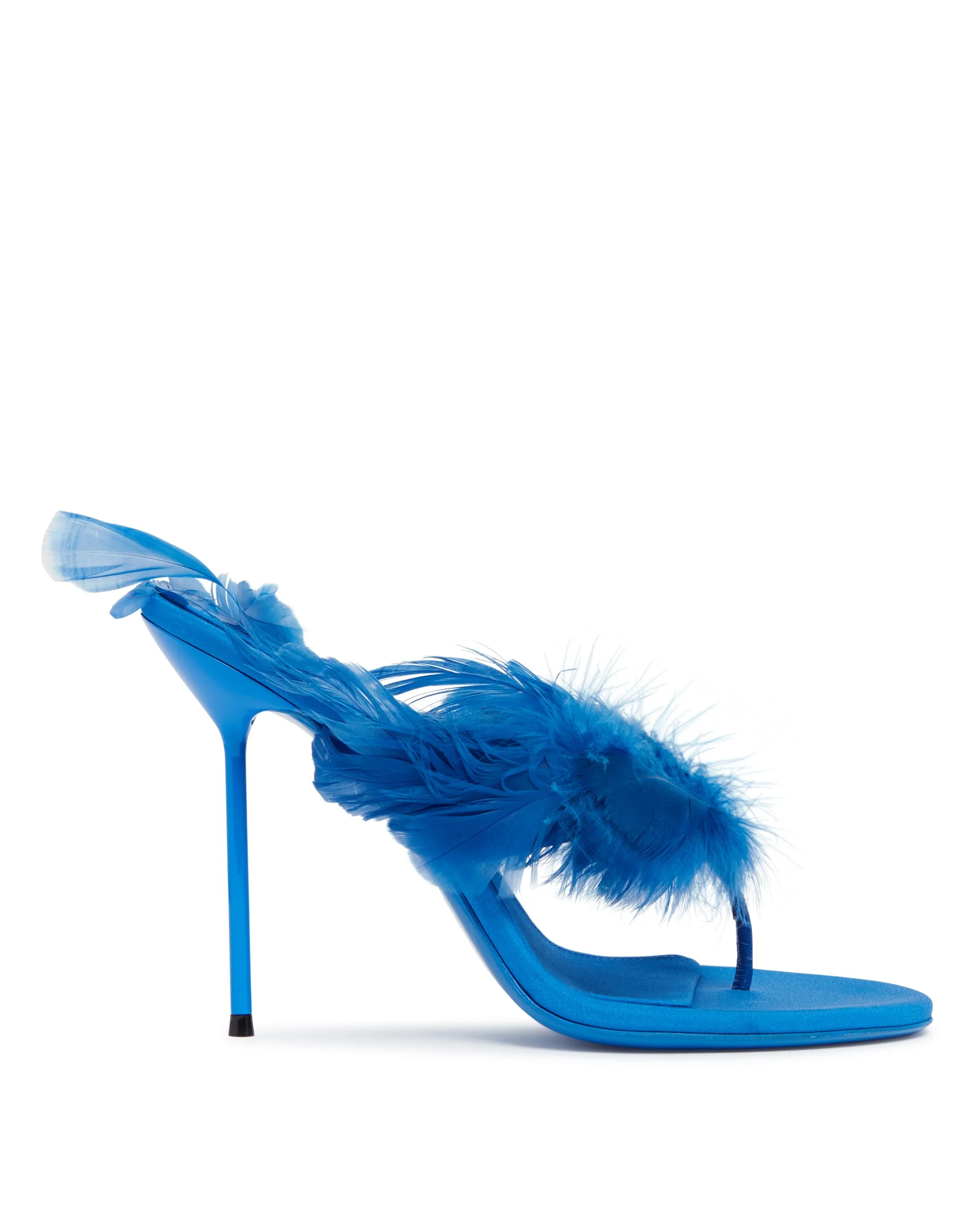 Paris Texas Blue Lidia Feathered Mules. Blue satin and leather upper, tone-on-tone feathers, open round toe with toe-loop construction, high tone-on-tone stiletto heel, open back, tone-on-tone leather sole. Heel Height: 11 cm DETAILS Model: PX1821XCRPFTUR Composition: 100% Leather Made in: ITALY Season: SS26