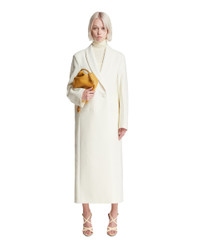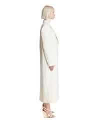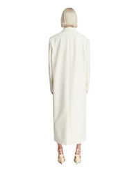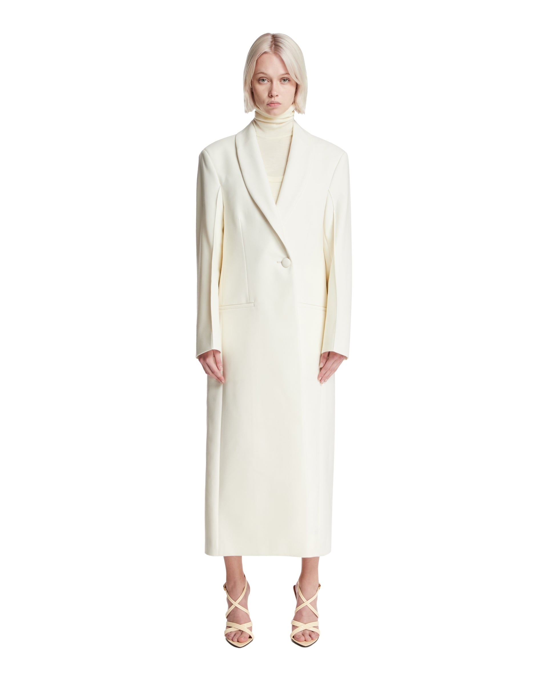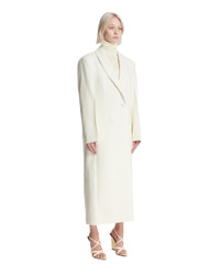 Rohe White Signature Opera Coat. White wool blend, long sleeves, double-breasted notched lapels, central back slit, welt pockets. Fitted silhouette, fully lined. Greeta is 172 cm and she is wearing size 36. DETAILS Model: 41610158104309 Composition: 53% Polyester, 43% Virgin Wool, 4% Lyocell; Lining: 100% Viscose Made in: PORTUGAL Season: FW25-26