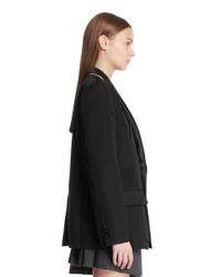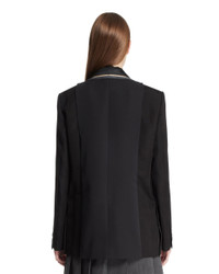Sacai Black Double-Breasted Tailored Blazer. Black wool blend, long sleeves, double-breasted design, lapels with contrasting inserts and decorative stitching, asymmetric hem. Relaxed fit. Perla is 176 cm and she is wearing size I. DETAILS Model: 2507937001 Composition: 55% Polyester, 45% Wool; Details: 50% Cotton, 50% Silk Made in: JAPAN Season: FW25-26