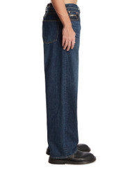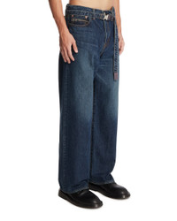 Sacai Blue Wide-Leg Jeans with Belt. Blue cotton denim, regular waist, detachable tone-on-tone belt, 5-pocket design, wide-leg cut, relaxed fit. Freddy is 187 cm and he is wearing size III. DETAILS Model: 2503757M401 Composition: 100% Cotton, Details. 50% Acetate, 50% Leather Made in: JAPAN Season: FW25-26