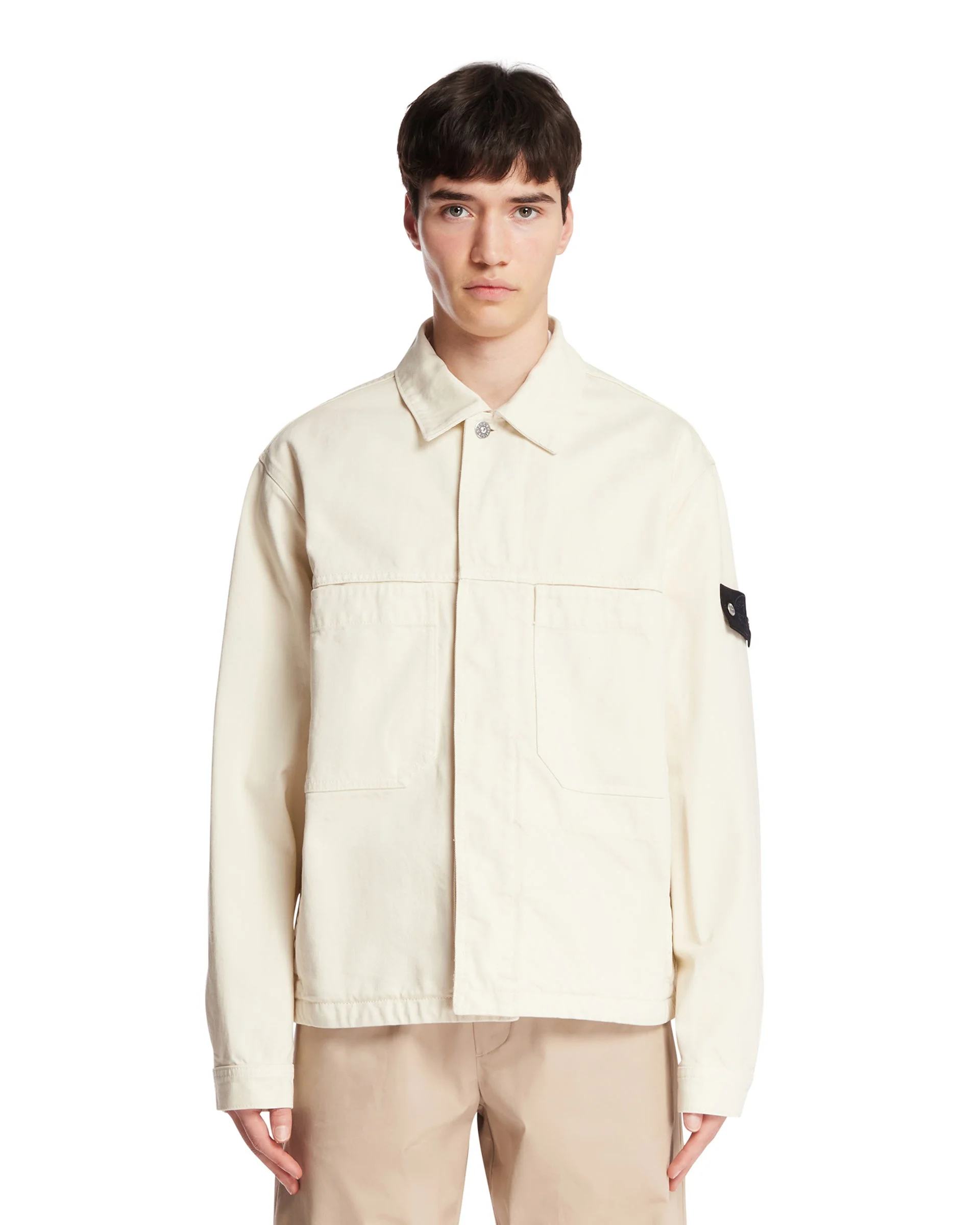 Stone Island White Denim Jacket. White cotton denim, classic collar, long sleeves with buttoned cuffs, concealed front closure, two patch pockets with hidden snap buttons, contrast stitching, Stone Island logo badge, straight hem. Gabo is 184 cm and he is wearing size XL. DETAILS Model: S144100006S0J24V0093 Composition: 100% Cotton Made in: ROMANIA Season: SS26
