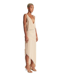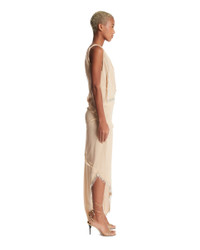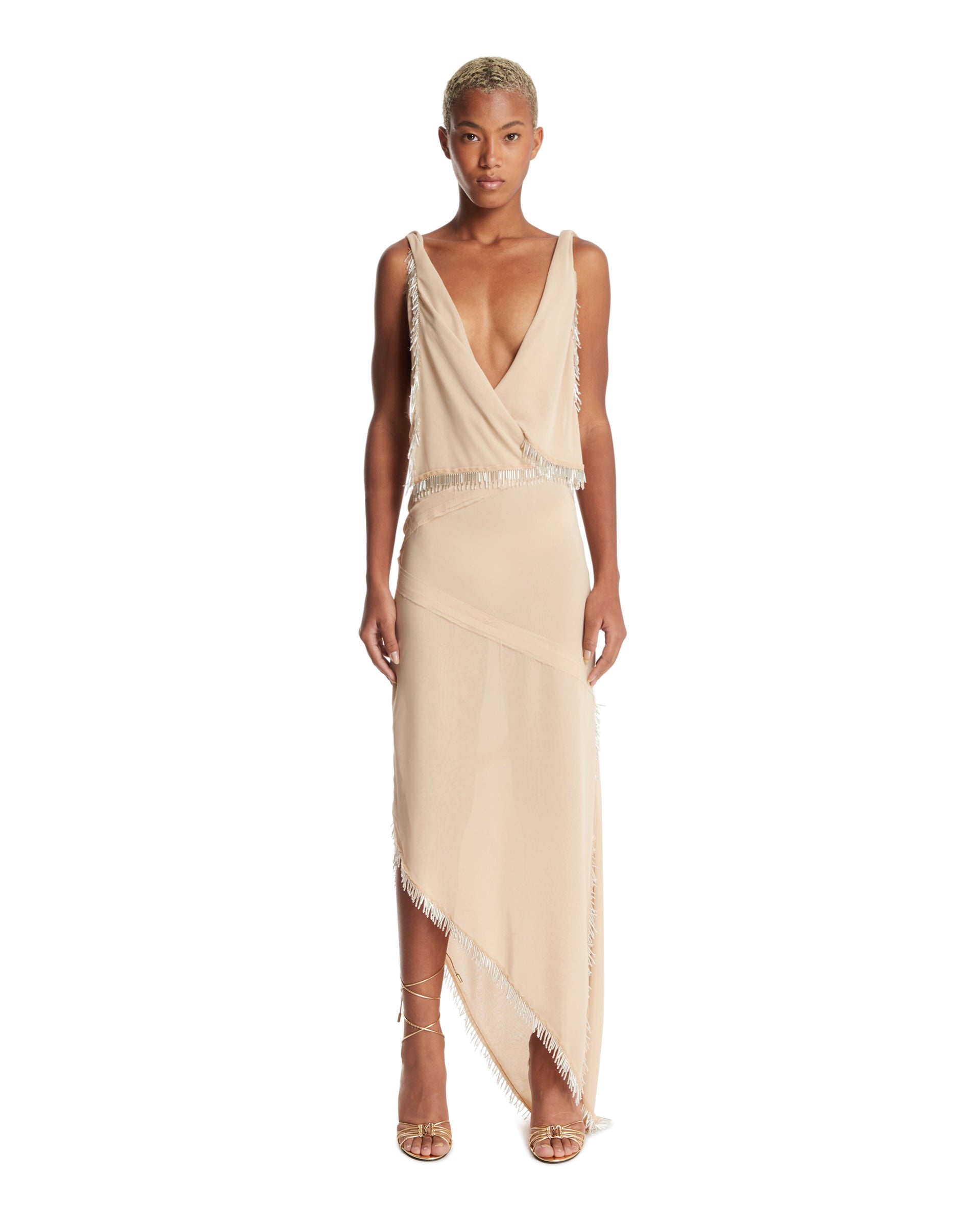 The Attico Beige Asymmetric Dress. Beige technical fabric, deep V-neckline, sleeveless, asymmetric hem, edges decorated with elongated beads, regular fit. Carol is 178 cm and she is wearing size 40. DETAILS Model: 251WCW00241PAA109RA701 Composition: 100% Polyester; Details: 100% Glass Made in: ITALY Season: FW25-26