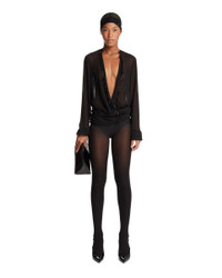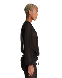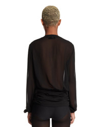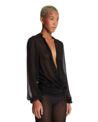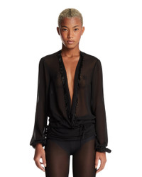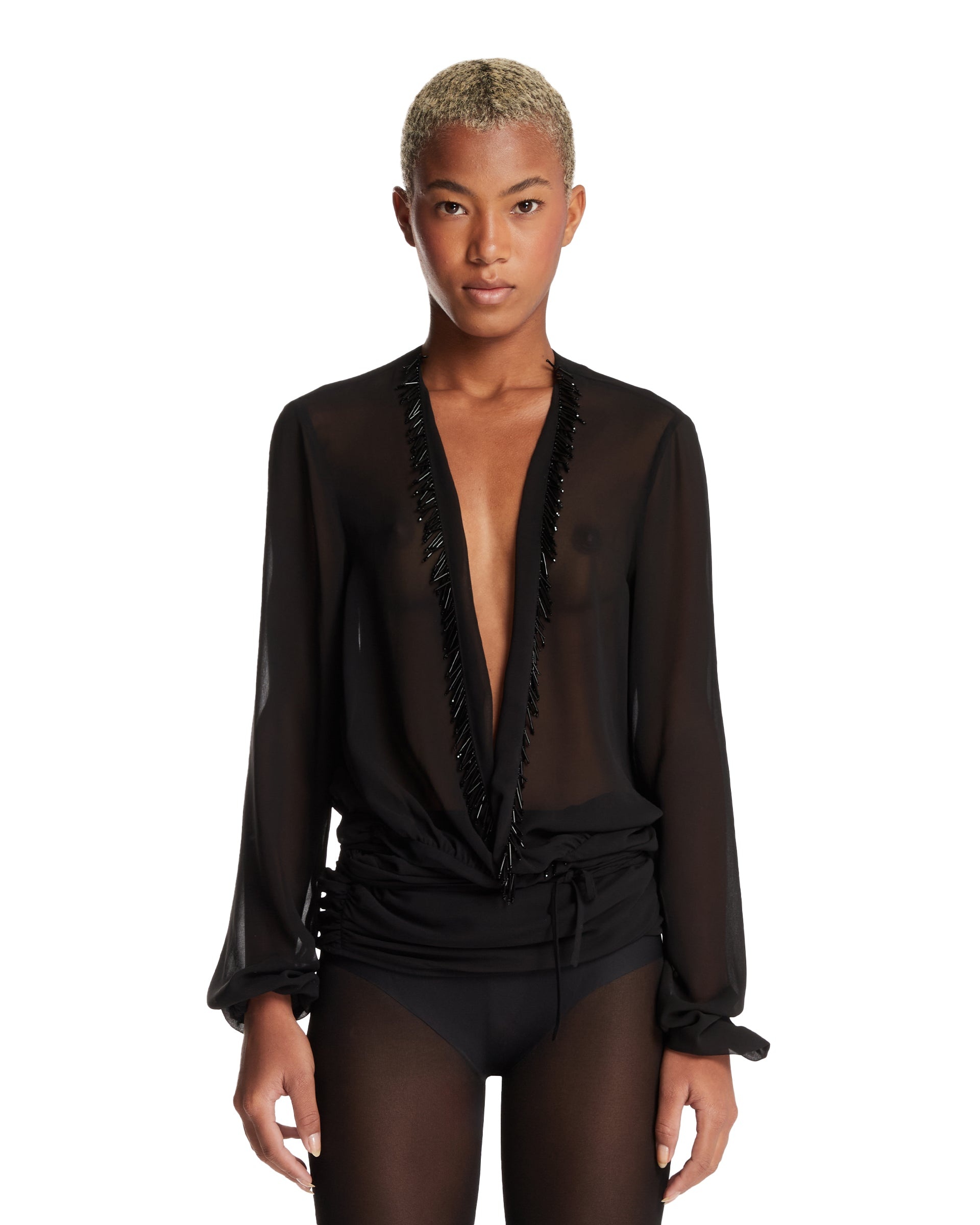 The Attico Black Georgette Blouse. Black georgette, long sleeves, deep V-neckline embellished with tone-on-tone beaded embroidery. Elasticated hem, draping and side tie, elasticated cuffs. Relaxed fit. Carol is 178 cm and she is wearing size 40. DETAILS Model: 251WCE00003PAA085RA100 Composition: 100% Polyester; Details: 100% Glass Made in: ITALY Season: FW25-26
