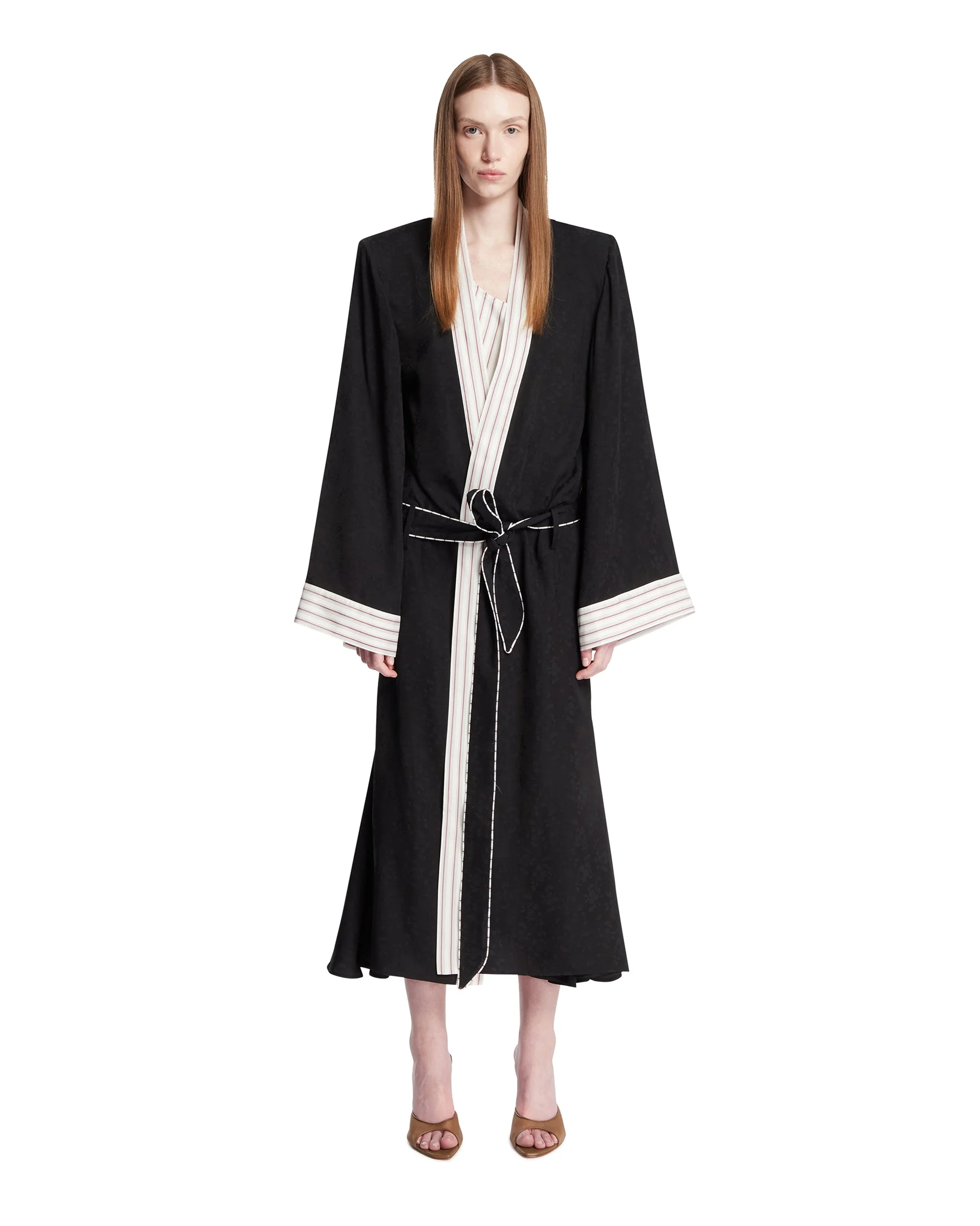 The Attico Black Kimono Dress. Black viscose blend, contrasting striped cupro trims, V-neckline, wide long sleeves, padded shoulders. Detachable tone-on-tone waist belt with loops. Midi length, relaxed fit. Yana is 178 cm and she is wearing size 40. DETAILS Model: 260WCC00095MIX076AA021 Composition: 56% Modal, 44% Viscosa; Details: 100% Cupro Made in: ITALY Season: SS26