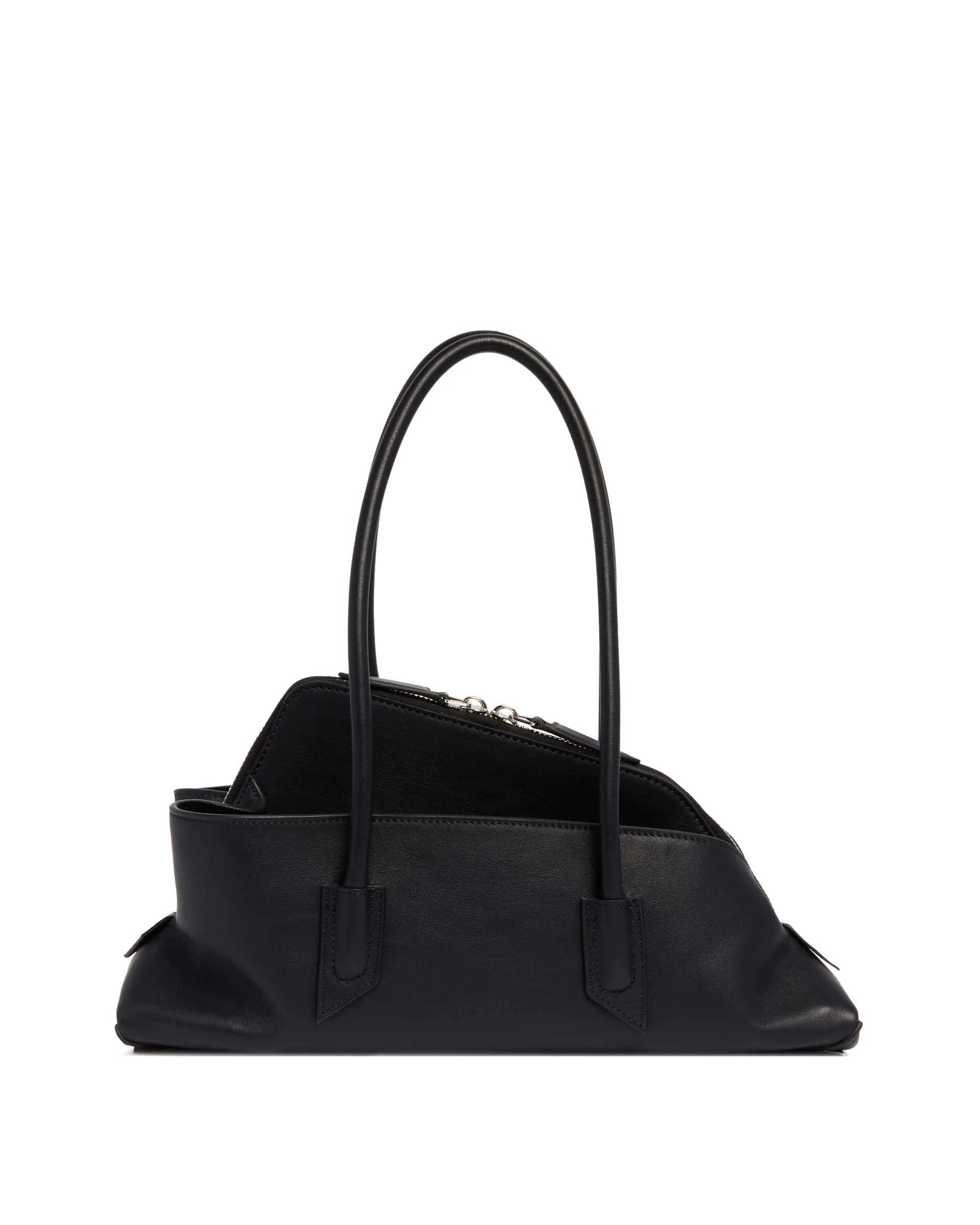 The Attico Black Small La Passeggiata Leather Bag. Black leather, tone-on-tone handles, zipper closure. Leather lining, open internal pocket, tone-on-tone stitching, silver-tone hardware. Asymmetric trapeze silhouette. Size (cm): 34X18X10 DETAILS Model: 250WAH00058LBT019AA100 Composition: 100% Leather; Details: 100% Brass Made in: ITALY Season: SS25