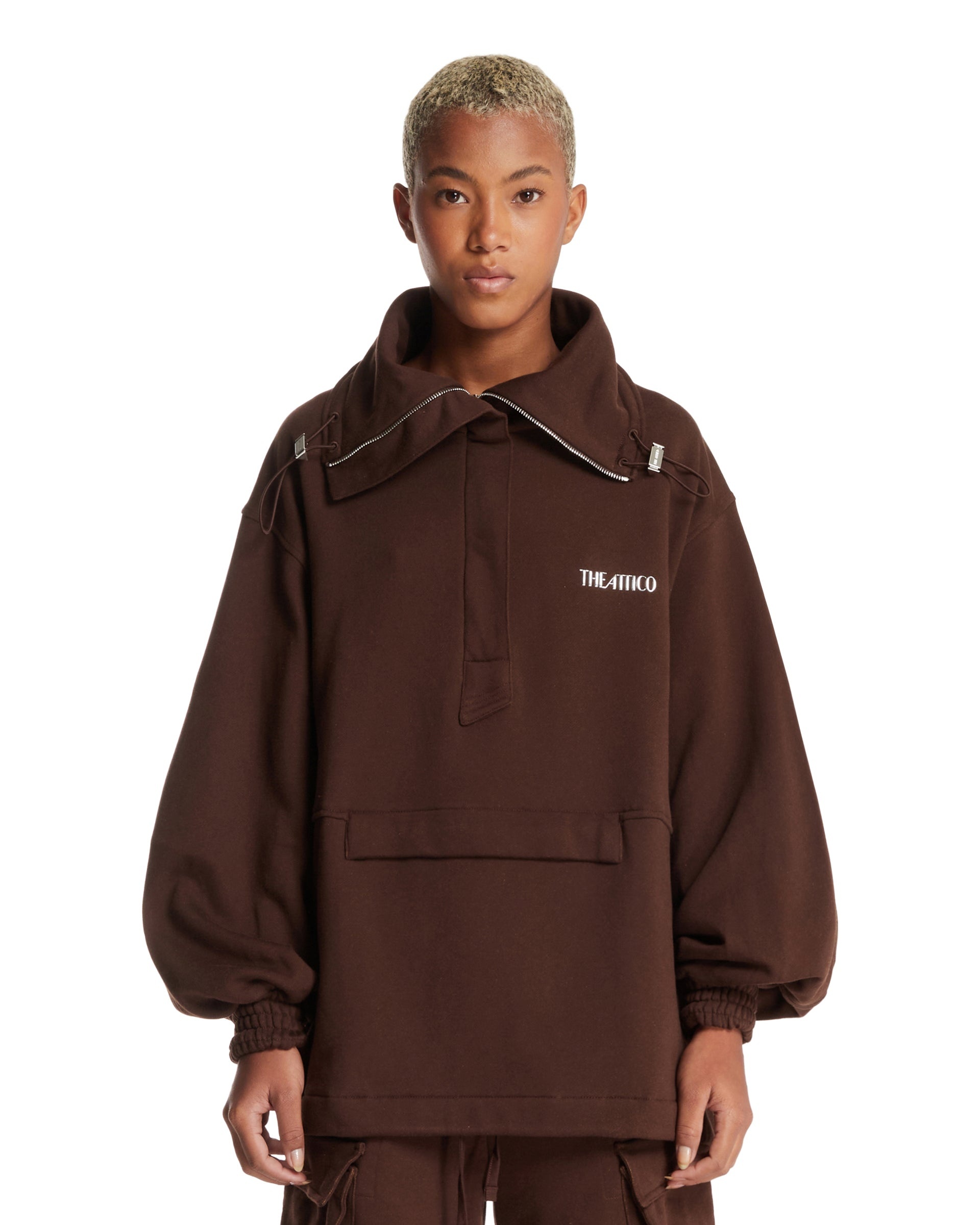The Attico Brown Cotton Anorak Sweatshirt. Brown cotton, long wide sleeves, elastic cuffs, dropped shoulders. Front half-zip closure, large front pocket, straight hem with drawstring. Relaxed fit, contrast logo on the chest. Carol is 178 cm and she is wearing size 40. DETAILS Model: 251WCB00091JJF007AA204 Composition: 100% Cotton Made in: ITALY Season: FW25-26