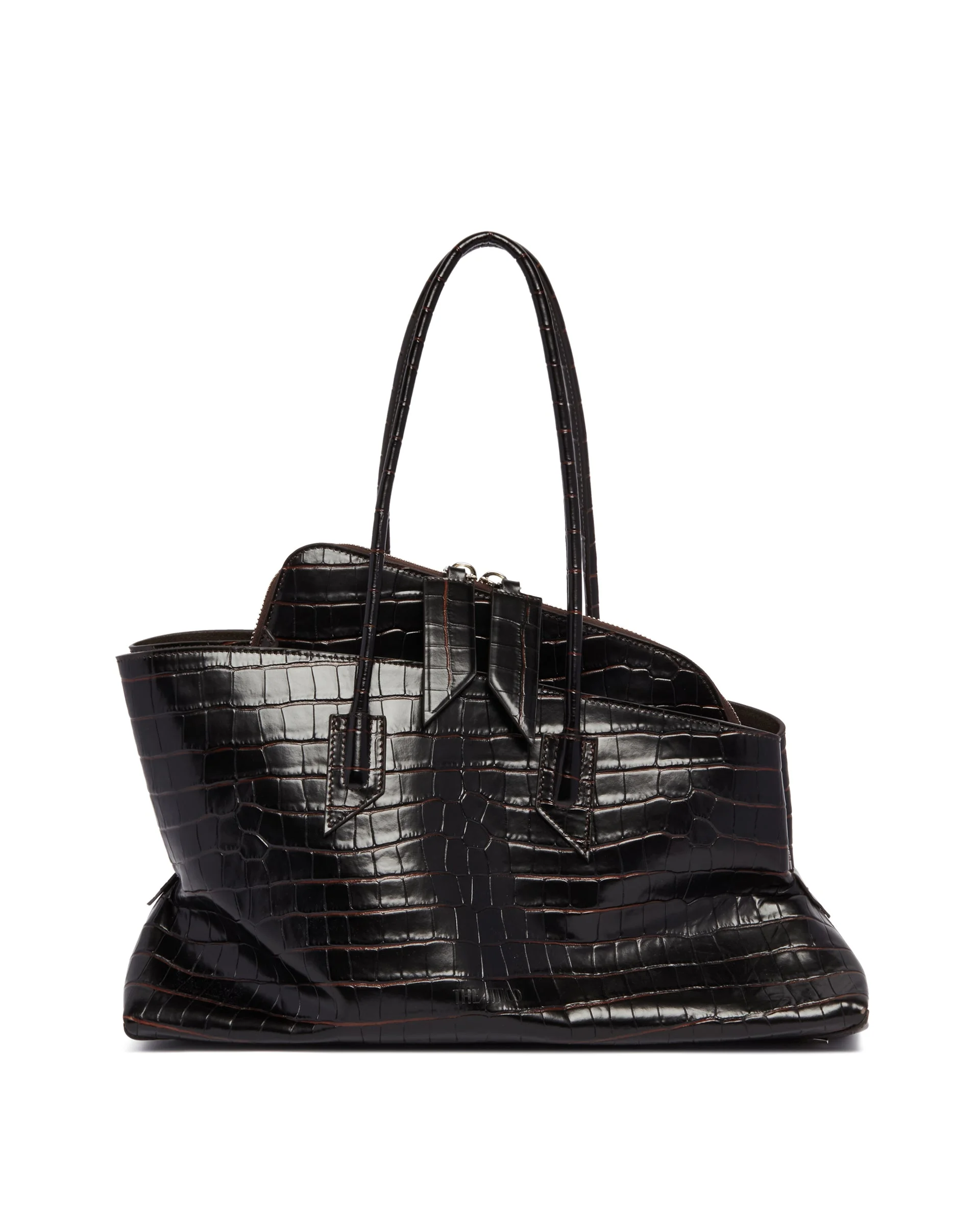 The Attico Brown Croco Print Leather La Passeggiata Bag. Brown leather with a croco print allover, tonal shoulder strap, zip fastening. Suede lining, open pocket inside, tonal stitching, silver-tone hardware. Asymmetrical trapeze silhouette. Size (cm): 43X27X16 DETAILS Model: 250WAH00054LBT021PR207 Composition: 100% Leather Made in: ITALY Season: SS25