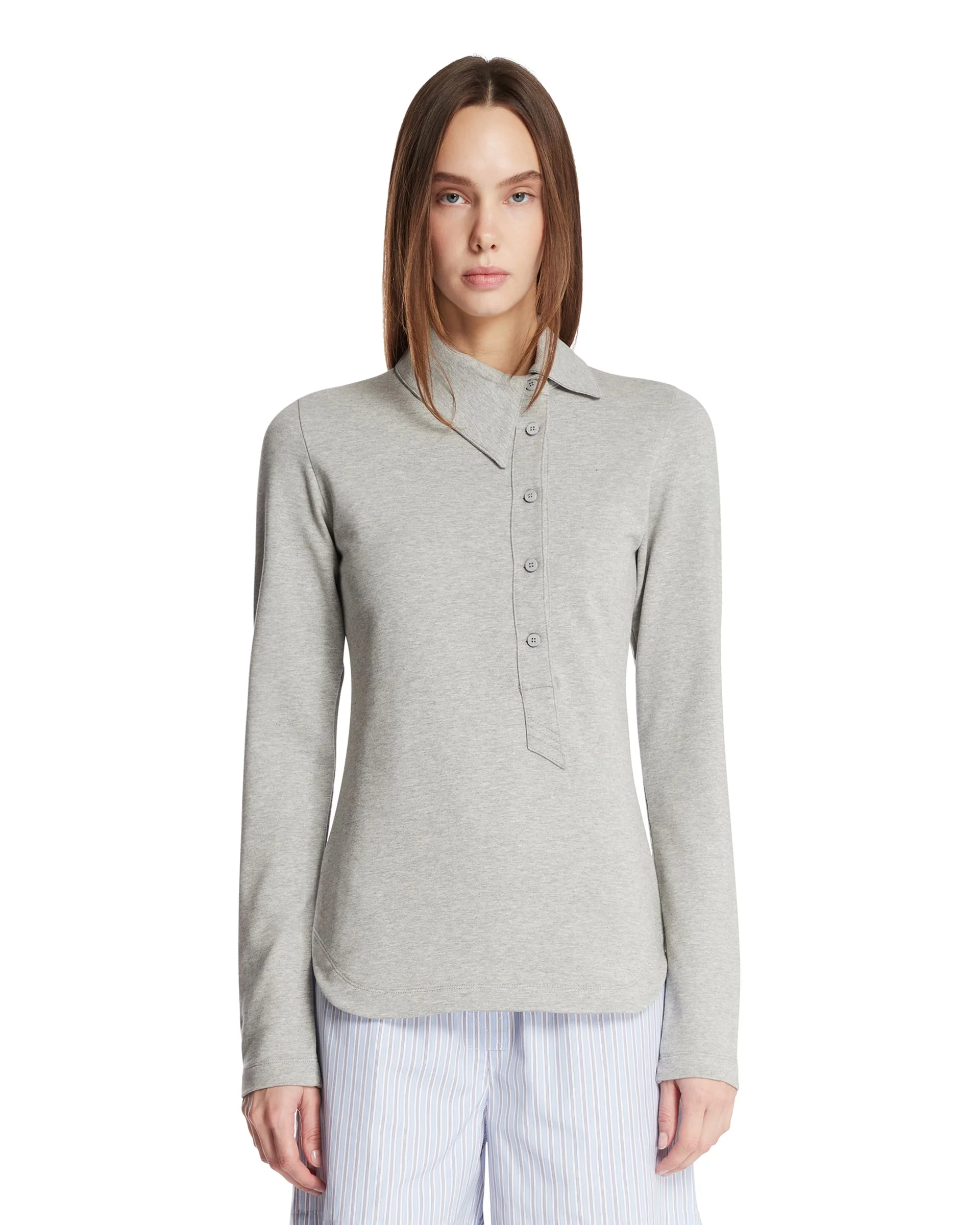 The Attico Gray Asymmetric Cotton Top. Gray cotton blend, asymmetric classic collar with front button closure. Long sleeves, fitted hem, regular fit. Daniele is 178 cm and she is wearing a size 40. DETAILS Model: 260WCI00031JJF006AA183 Composition: 96% Cotton, 4% Elastane Made in: PORTUGAL Season: SS26