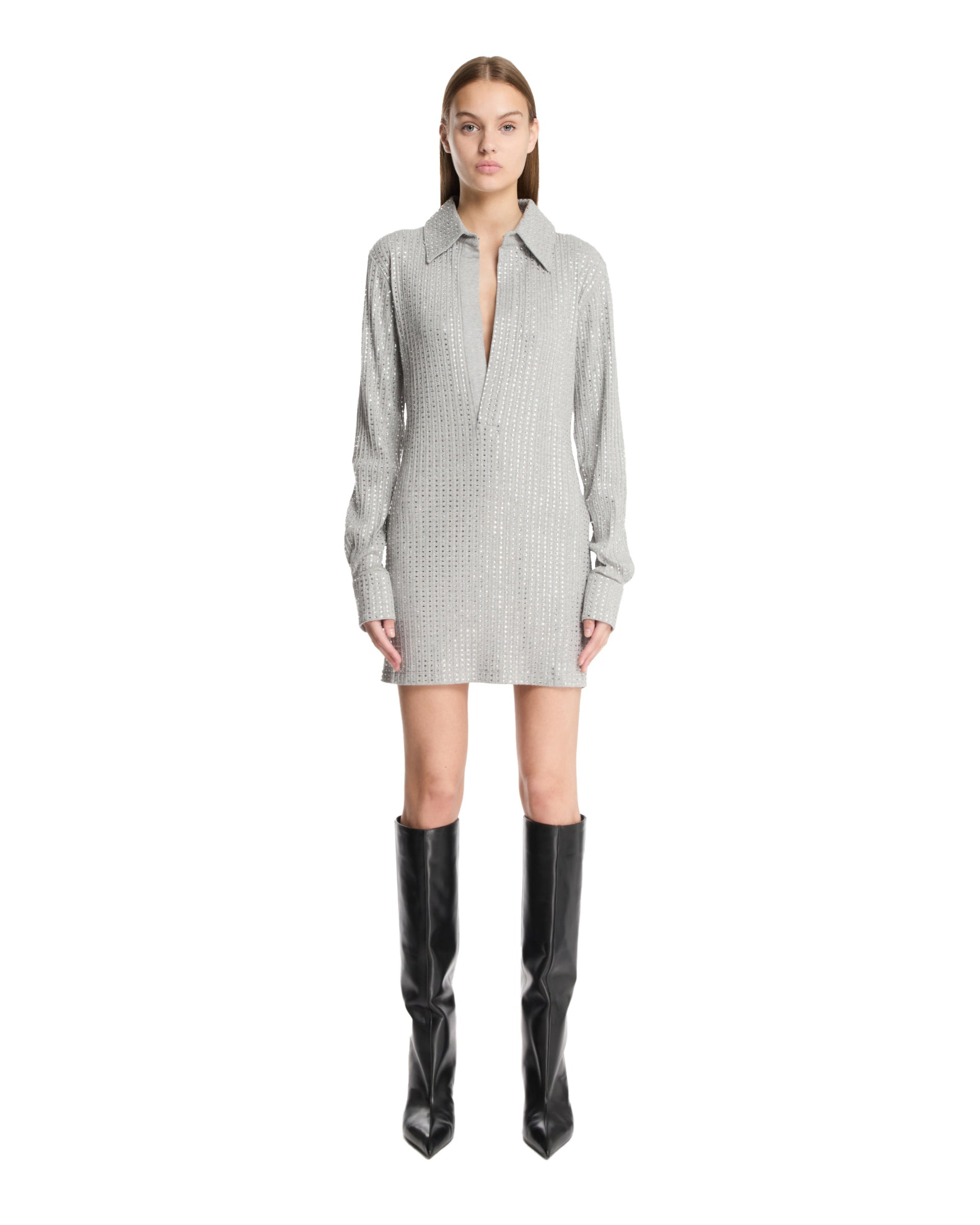 The Attico Gray Rhinestone Shirt Dress. Gray ribbed cotton with rhinestones all over. Long sleeves, buttoned cuffs, classic collar, deep front neckline, straight hem. Regular fit. Perla is 176 cm and she is wearing size 40. DETAILS Model: 251WCA00456JJJ051TR183 Composition: 100% Cotton; Details: 100% Glass Made in: PORTUGAL Season: FW25-26