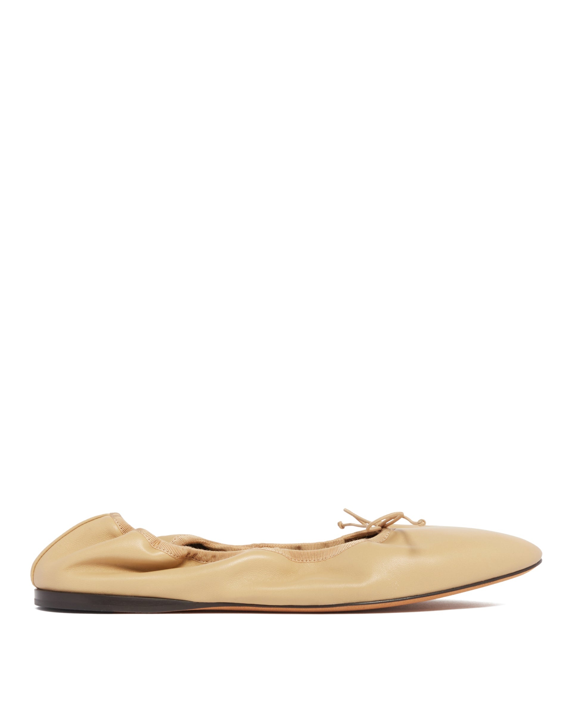 The Row Beige Leather Awar Ballerina Flats. Beige leather upper features an oval toe, grosgrain trims, and an adjustable elastic strap. Leather sole and leather lining. DETAILS Model: F1539N66LBE Composition: 100% Fabric; Sole: 100% Leather Made in: ITALY Season: FW24-25