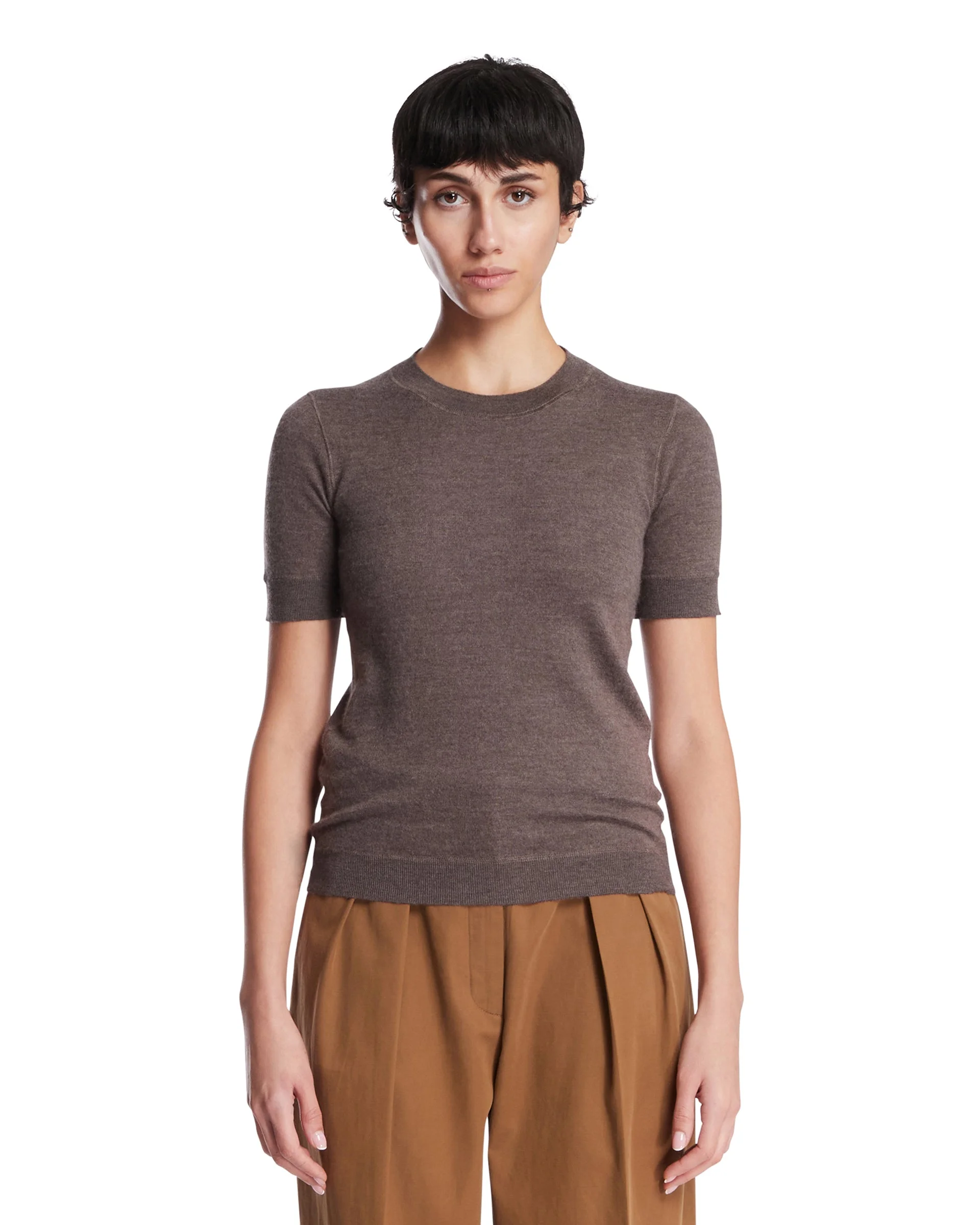 The Row Beige Linnea Cashmere Top. Beige cashmere, crew neckline, short sleeves, straight hem. Hidden stitch details, ribbed neckline, cuffs and hem. Slim fit. Anis is 178 cm and she is wearing size XS. DETAILS Model: 10025Y212FDB Composition: 100% Cashmere Made in: ITALY Season: FW25-26