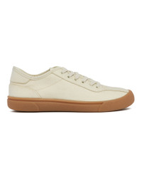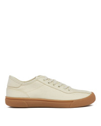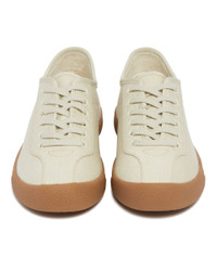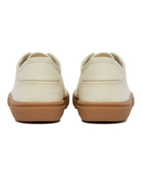 The Row Beige Viscose and Linen Canvas Sneakers. Beige fabric and linen upper, tone-on-tone grosgrain trim, stitched details, embossed rubber sole, classic lacing, regular fit. DETAILS Model: F1611SPCSAT Composition: Upper: 100% Fabric; Sole: 100% Rubber Made in: ITALY Season: SS25