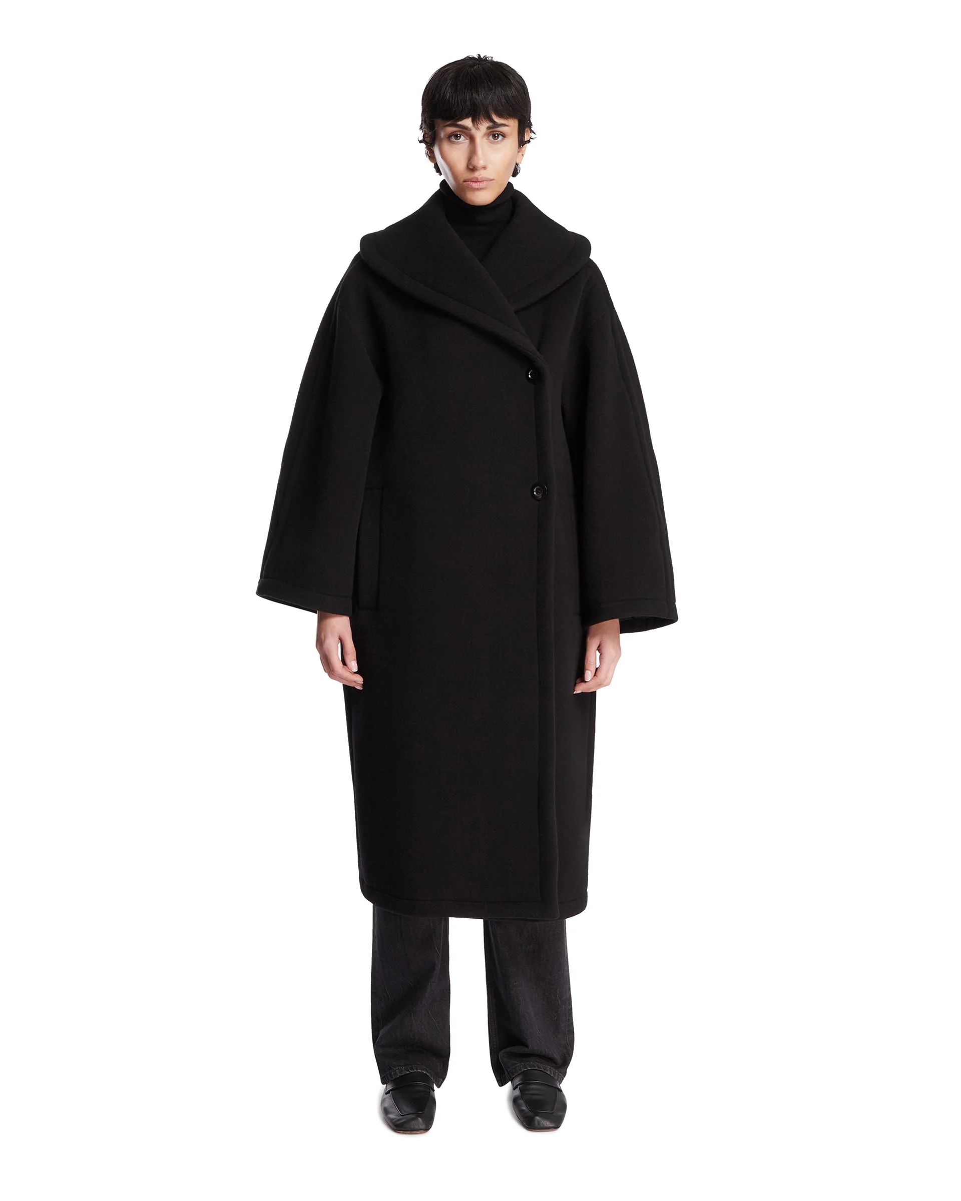The Row Black Regino Wool Coat. Black wool, silk lining, oversized cocoon silhouette, sculptural collar, welt pockets, horn button closure. Anis is 178 cm and she is wearing size 4. DETAILS Model: 10513W4238BLK Composition: 100% Virgin Wool; Lining: 100% Silk Made in: ITALY Season: FW25-26