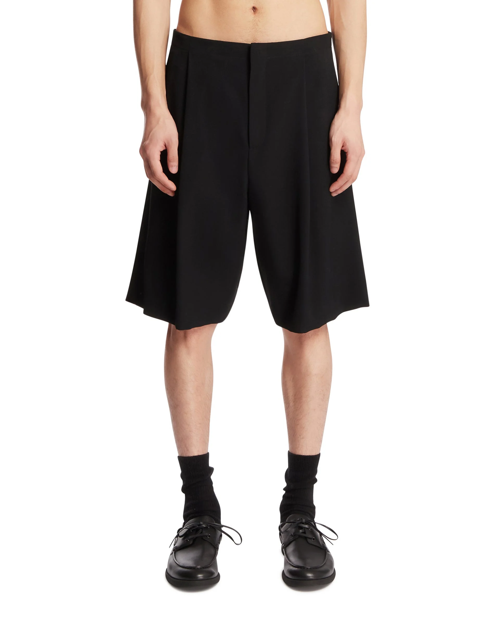 The Row Black Sayed Wool Shorts. Black wool, wide-leg, seamless side design, side welt pockets. Silk lining, regular fit. Minyung is 185 cm and he is wearing size 32. DETAILS Model: 1343W4319BLK Composition: 100% Wool; Lining: 100% Silk Made in: ITALY Season: SS26