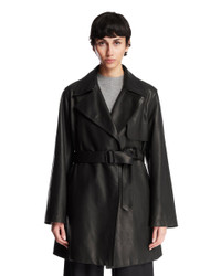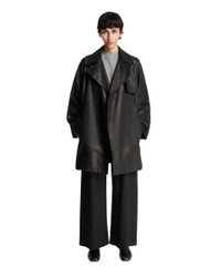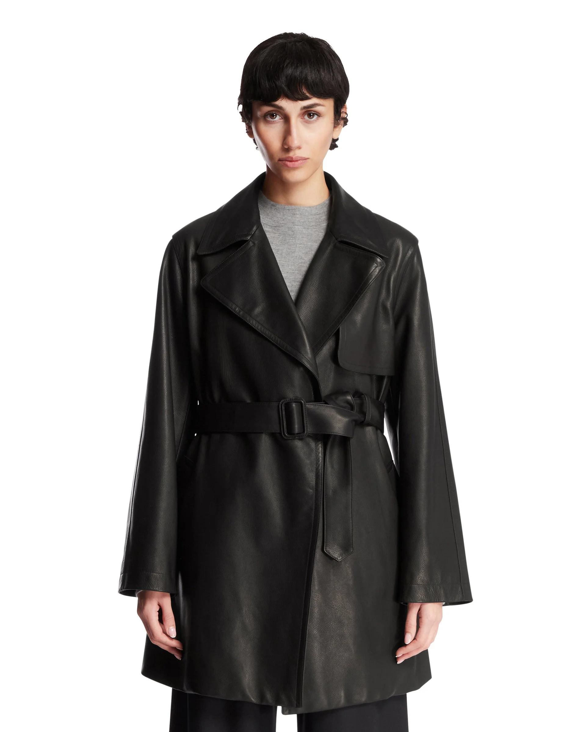 The Row Black Siempra Leather Coat. Black leather, double-breasted design, long sleeves, wide notch lapels, welt pockets, tone-on-tone removable buckle belt. Regular fit. Anis is 178 cm and she is wearing size 4. DETAILS Model: 10496L640BLK Composition: 100% Leather Made in: ITALY Season: FW25-26