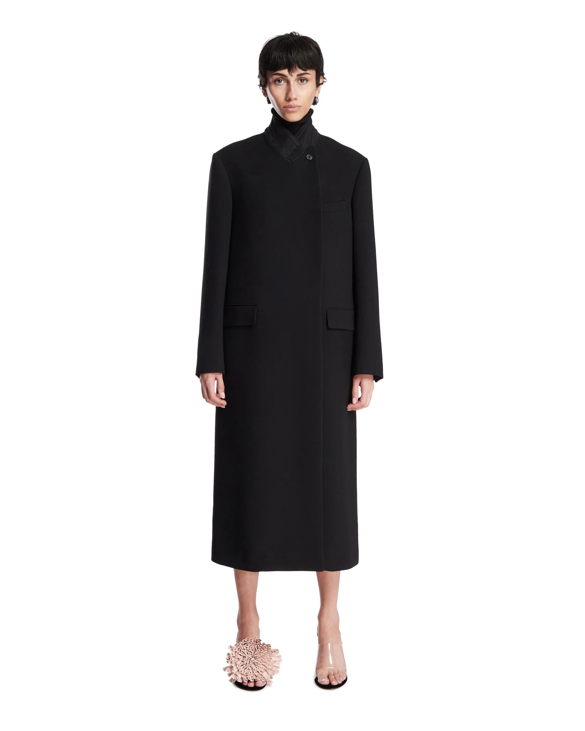 The Row Black Wool Coat. Black wool, silk lining, stand-up collar with button, long sleeves. Flap side pockets, calf-length, regular fit. Anis is 178 cm and she is wearing size 4. DETAILS Model: 10659W2893BLK Composition: 100% Virgin Wool; Lining: 100% Silk Made in: ITALY Season: FW25-26