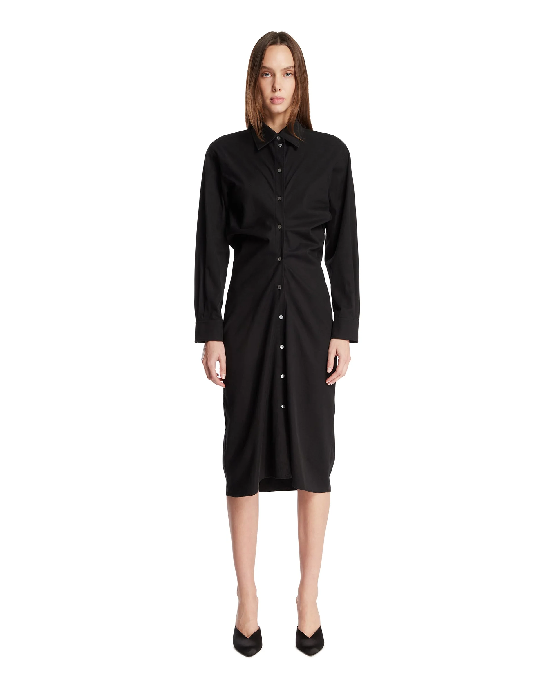 The Row Black Yuske Dress. Black cotton-cashmere blend, classic collar, long sleeves with buttoned cuffs, front button closure, draped waist, asymmetric hem. Daniele is 178 cm and she is wearing size 2. DETAILS Model: 10254W3670BLK Composition: 95% Cotton, 5% Cashmere Made in: ITALY Season: FW25-26