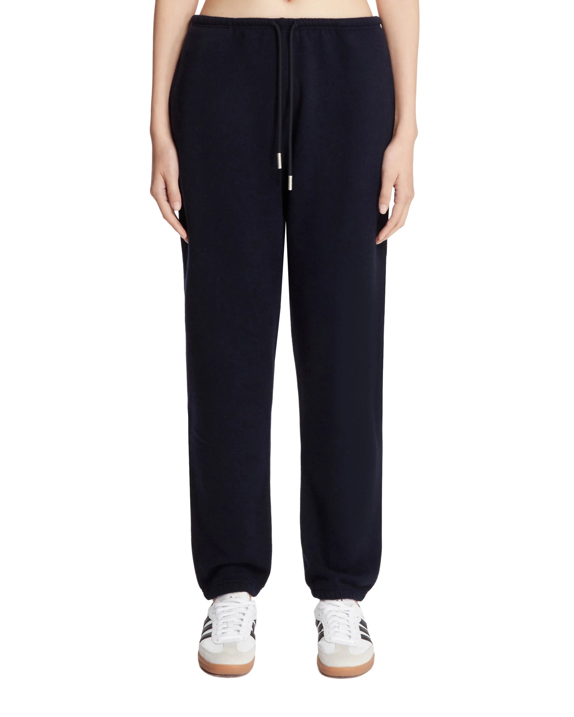 The Row Teo Cashmere and Cotton Pants. Blue cotton French terry, slightly tapered leg, drawstring waist, and side seam pockets and mid-rise. Relaxed fit. Bao Xin is 178 cm and she is wearing a size S. DETAILS Model: 8330K995NVY Composition: 69% Cashmere, 31% Cotton Made in: ITALY Season: FW24-25