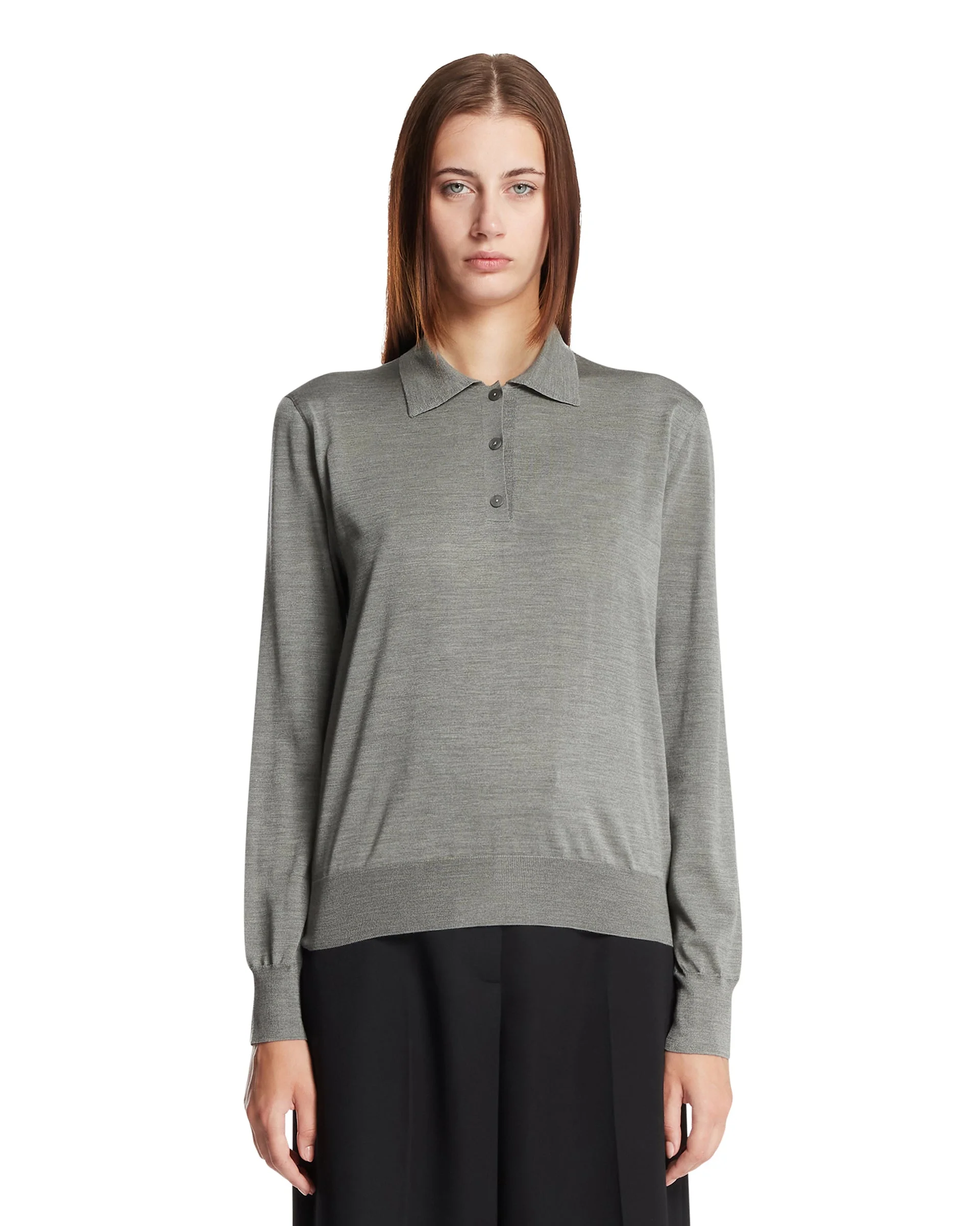The Row Gray Long-Sleeve Silk Polo. Made of gray silk, it features a polo collar, long sleeves, three buttons on the front placket, and ribbed hem and cuffs. Relaxed fit. Kate is 179 cm and she is wearing size S. DETAILS Model: 10010Y885GYM Composition: 100% Silk Made in: ITALY Season: FW25-26