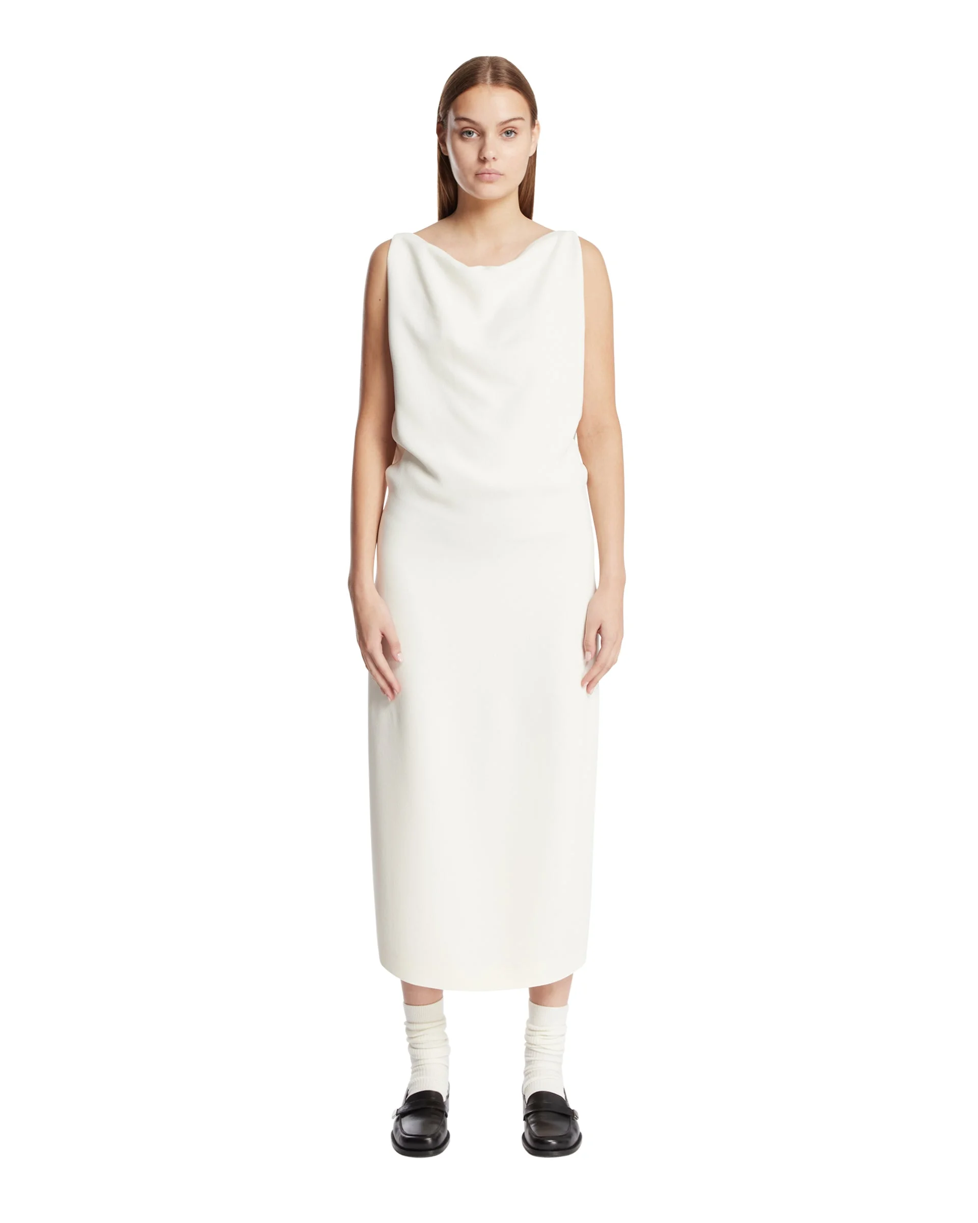 The Row White Paran Silk Dress. White smooth silk, open back slit, center back slit at the hem, hidden back zip closure with hook-and-eye fastening at the neckline. Sleeveless, boat neckline, calf-length, column silhouette. Perla is 176 cm and she is wearing size 4. DETAILS Model: 10219W2214WHT Composition: 100% Silk; Lining: 100% Silk Made in: ITALY Season: FW25-26