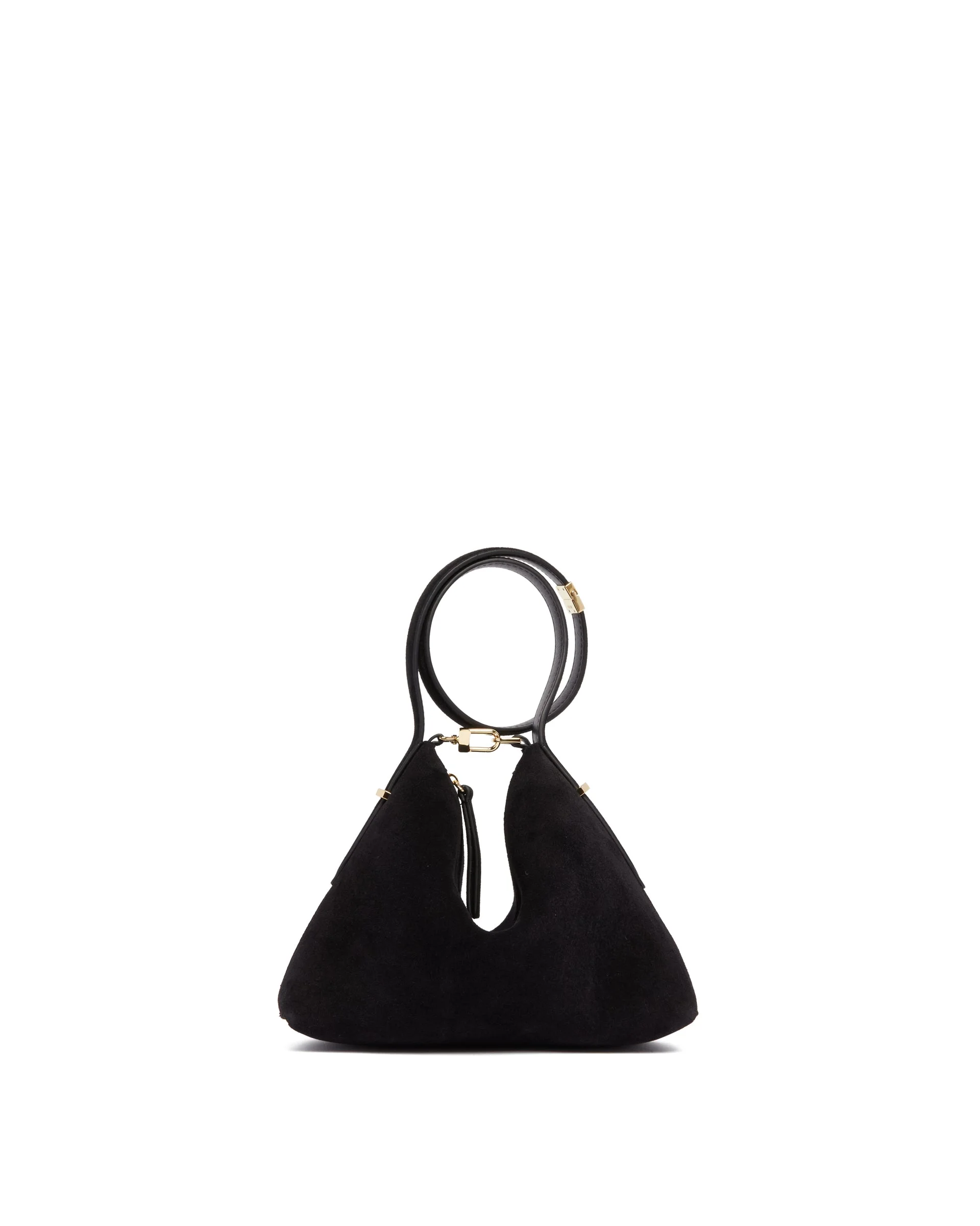 Toteme Black Bevel Wristlet. Black suede, geometric silhouette, gold-tone clasp, zipper closure, wrist strap with a functional buckle, microsuede lining. Size (cm): 23X19X5 DETAILS Model: 254WAL0090LE0155001 Composition: 100% Leather; Details: 100% Brass Made in: ITALY Season: FW25-26