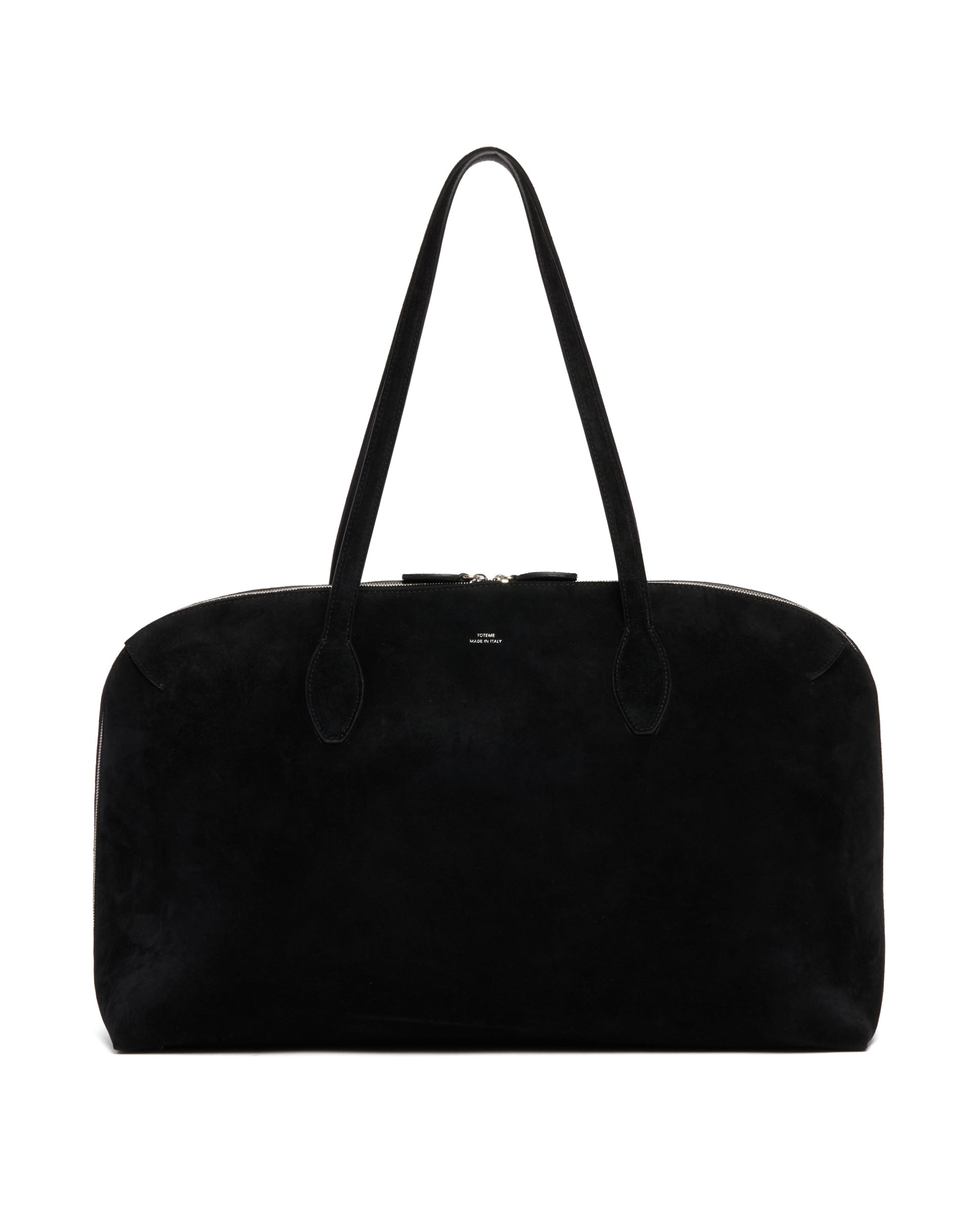 Toteme Black Day Bag. Black suede leather, double leather handles, rounded silhouette, double-slider zip closure, logo detail, metal feet, internal flat pocket, silver hardware. Size (cm): 47X25X15 DETAILS Model: 252WAL0082LE0004001 Composition: 100% Leather. Detail. 100% Brass Made in: ITALY Season: FW25-26
