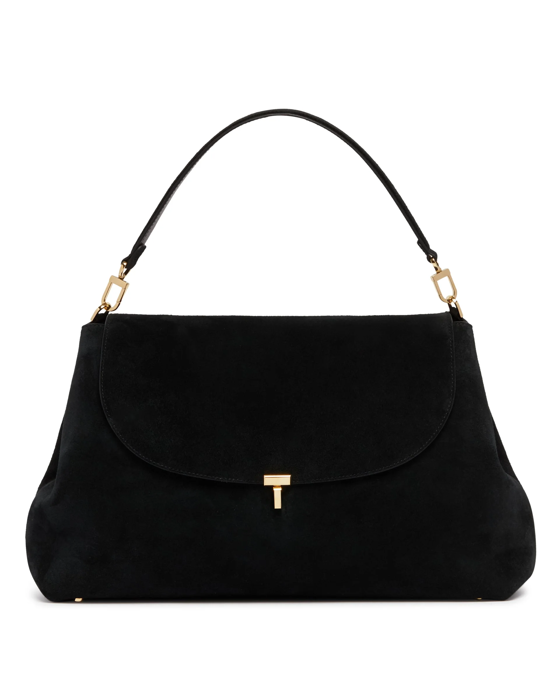 Toteme Black T-Lock Satchel Bag. Black suede leather, adjustable and removable shoulder strap, removable handle, T-Lock flap closure, metal feet, internal flat pockets, gold hardware. Size (cm): 40X23X10 DETAILS Model: 261WAL0096LE0004001 Composition: 100% Leather Made in: ITALY Season: SS26